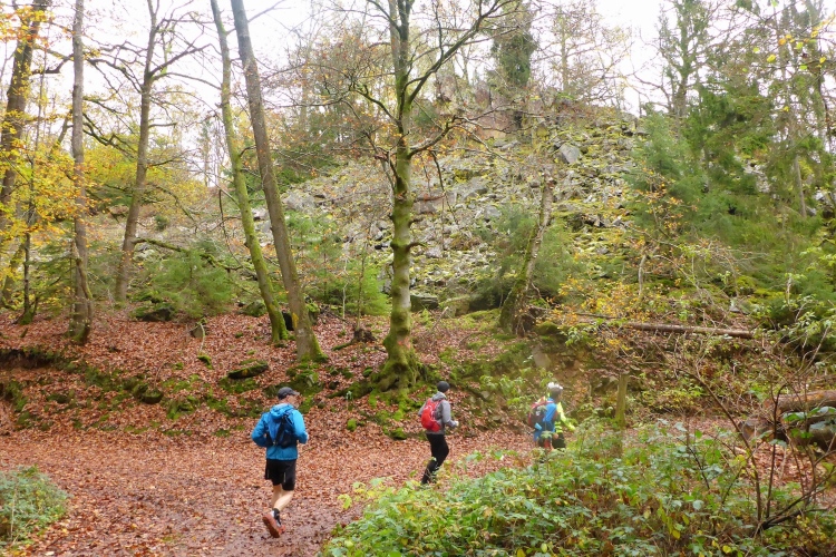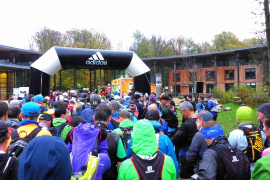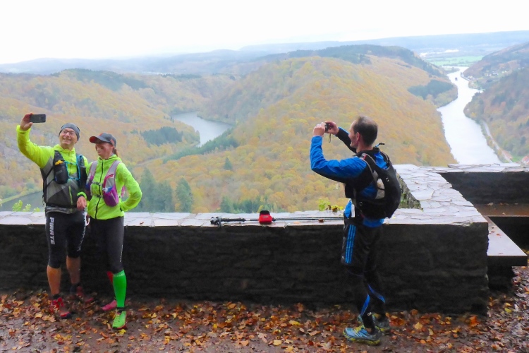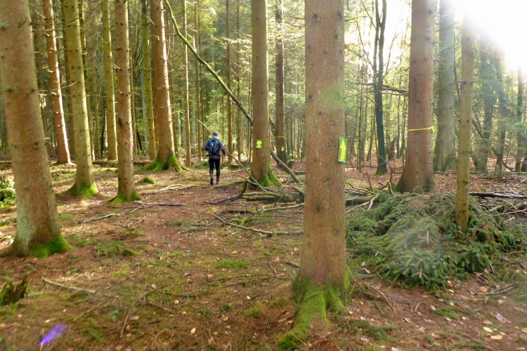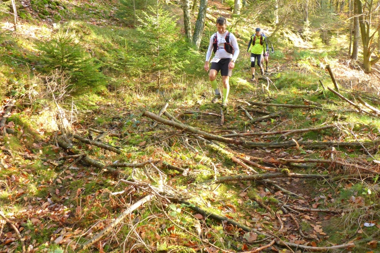 Während Nord- und Ostdeutschland an diesem Sonntag ins Sturmchaos gestürzt werden, hört der Regen im Saarland schon vor dem Start auf. An manchen Streckenabschnitten ist es etwas windig, aber meist laufen wir im Tal recht windgeschützt. Allerdings hat das Wetter in der Nacht einiges von der Streckenmarkierung ruiniert und wegen Sturmschäden musste sehr kurzfristig unsere Route von 61 km mit 2100 Höhenmetern auf 55 km gekürzt werden.