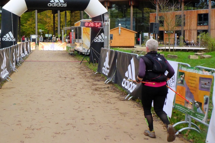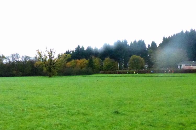 Um 7.30 Uhr ist es schon hell genug, um ohne Stirnlampe zu laufen. Gleich beim Start ist es anders als im letzten Jahr, denn wir laufen in die andere Richtung durch den Startbogen. Zuerst kommt eine etwa viertelstündige Runde durch den Wald. An einer Stelle kreuzt sich die Laufroute bei einer kleinen Schleife, so dass die langsamen Teilnehmer das Feld der schnelleren queren müssen. Gleich darauf laufen wir beim Cloef-Atrium erneut über die Start/Ziellinie, nun in anderer Richtung. Es folgt eine Runde am Rand von Orscholz.