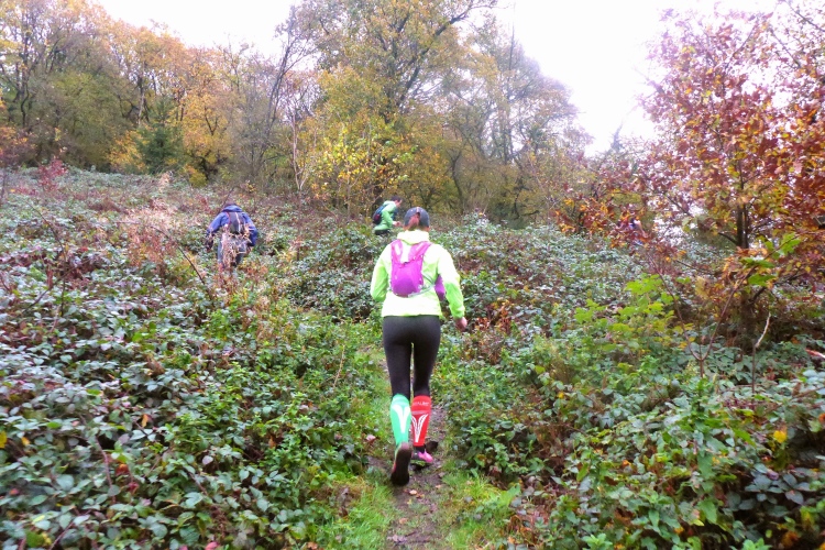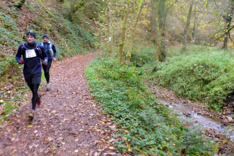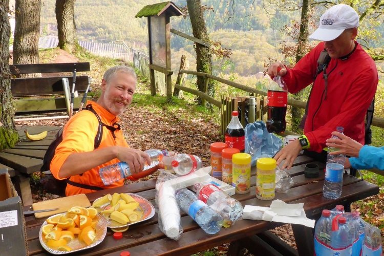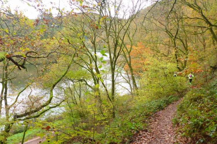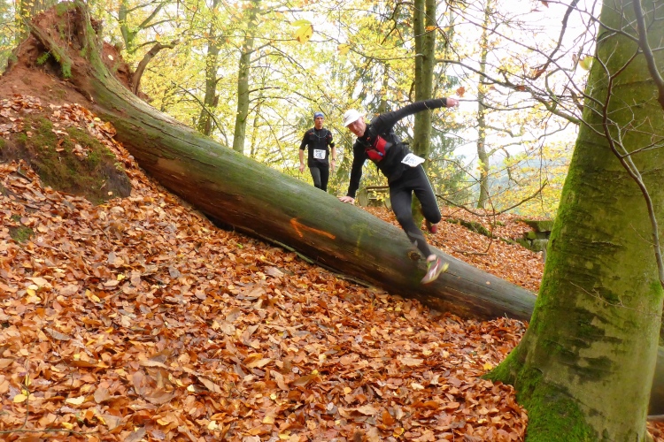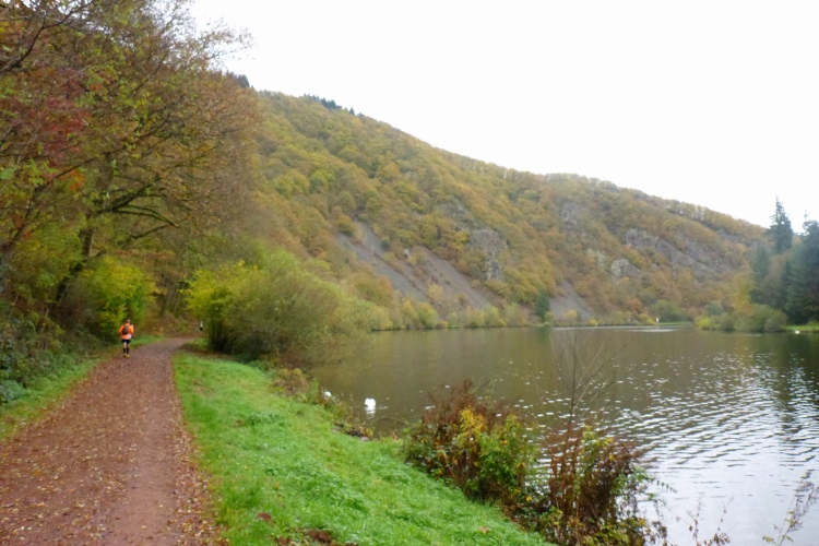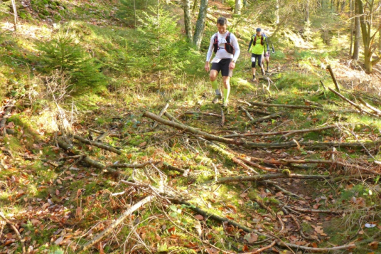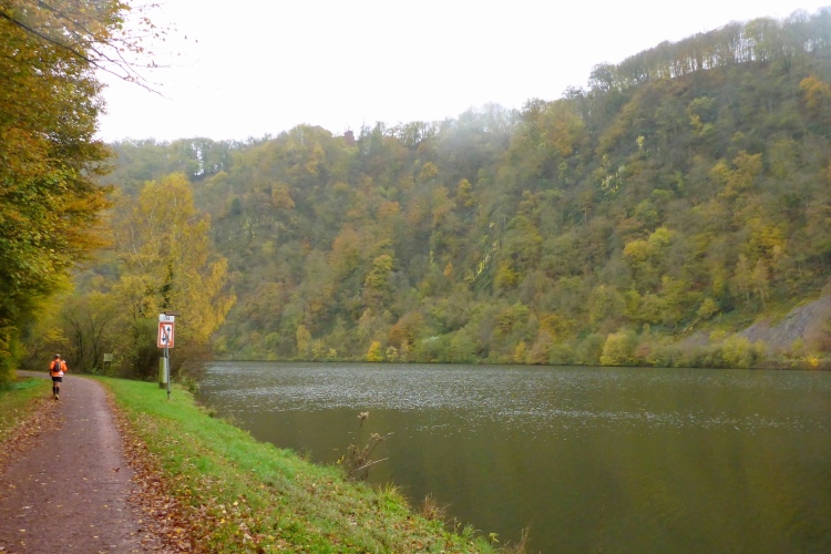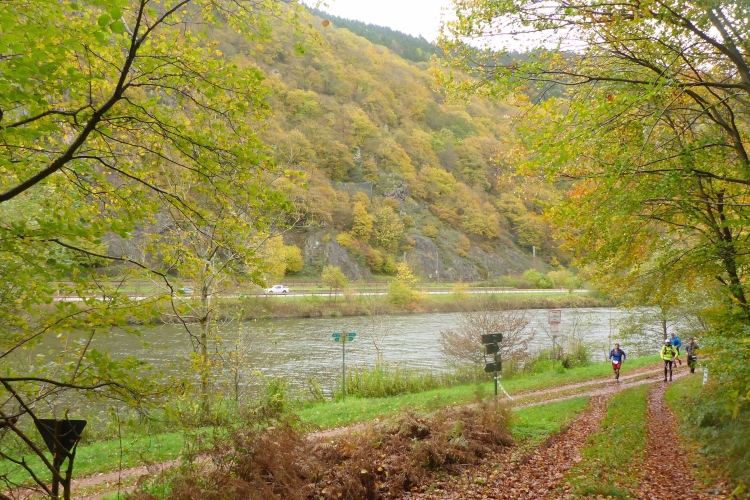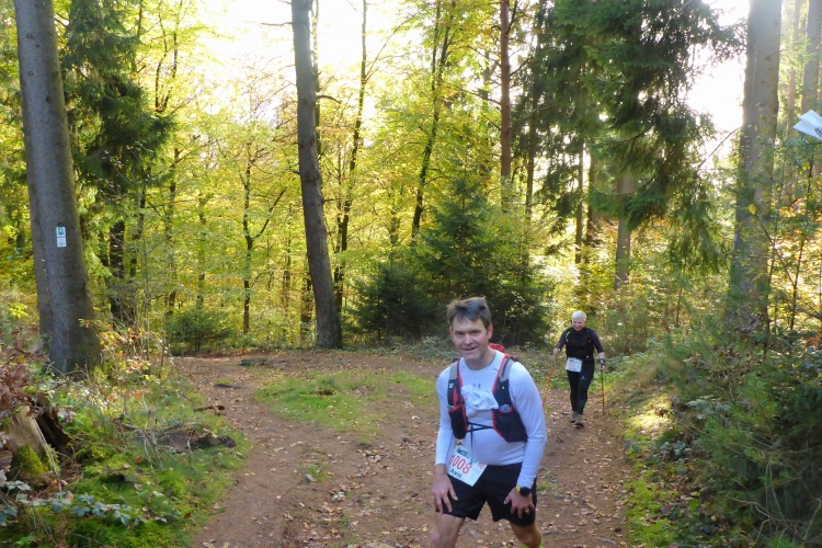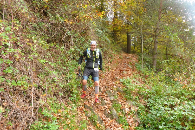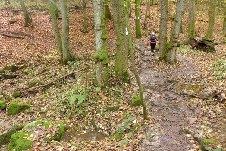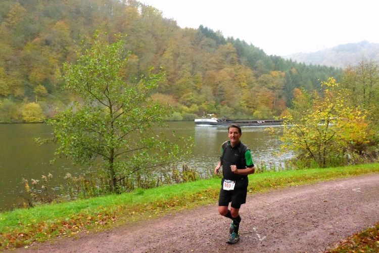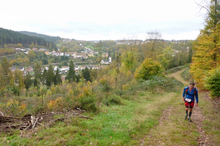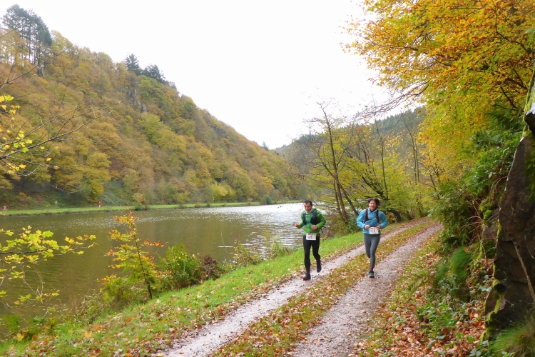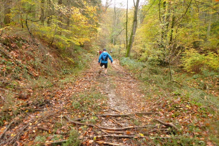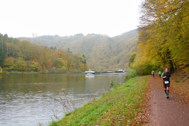 Auf einem Trail geht es in hohem Tempo bergab. Ach, wie froh ich bin, heute wieder dabei sein! Unten laufen wir eine Weile am Ufer der Saar entlang. Darauf folgt auch bald der nächste Aufstieg. Oben müssen wir wieder gut wegen der Streckenführung aufpassen, denn wer an einer Stelle nicht merkt, dass er anstatt geradeaus zu den Läufern, die er etwa 200 m vor sich sieht, weiter zu rennen, zuerst einen steilen Weg links hinauf zur Verpflegungsstelle und Zeitmessmatte muss, der hat Pech. Die mit Kreidespray auf das Laub gesprühten Pfeile sind nach dem nächtlichen Regen und nachdem so viele Leute darüber gelaufen sind, kaum noch erkennbar. Doch wie schon gesagt: mit etwas Aufmerksamkeit gelingt die Orientierung.