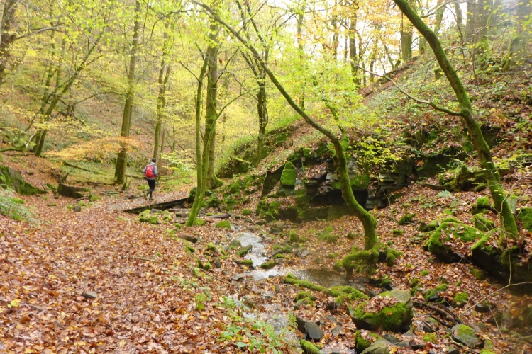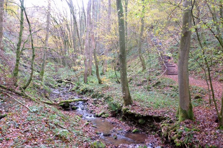 Durch ein schönes Tal, in dem mehrere Brücken über einen plätschernden Bach führen, geht es nun schnell bergab. Schade, dass es durch die dichte Bewölkung im Wald noch immer zu dunkel zum Fotografieren ist. Unten an der Saar ist die erste Verpflegungsstelle.