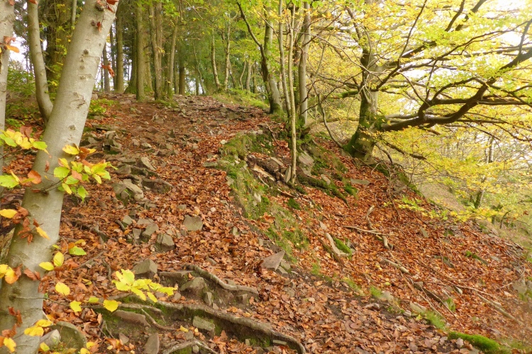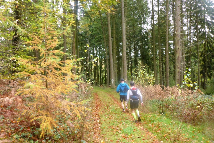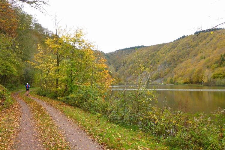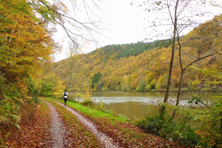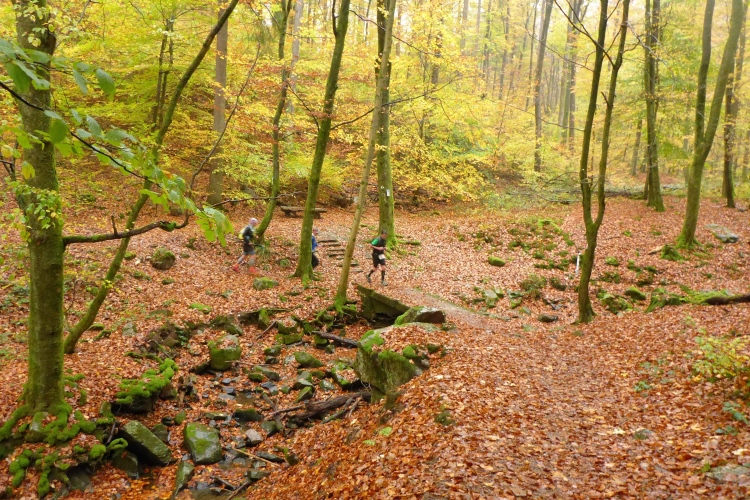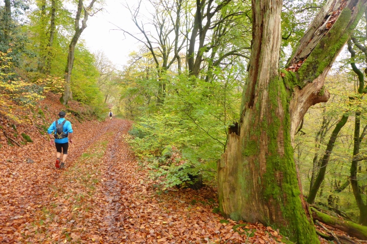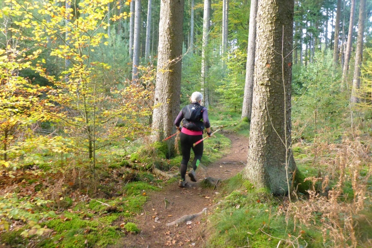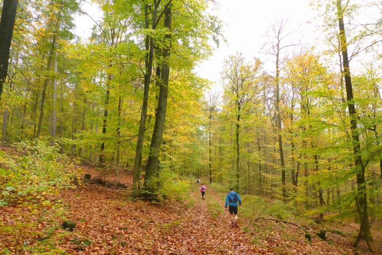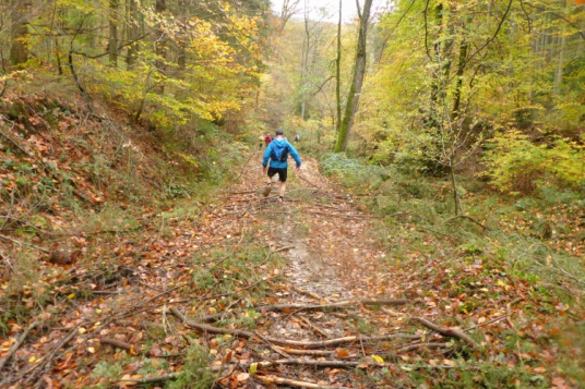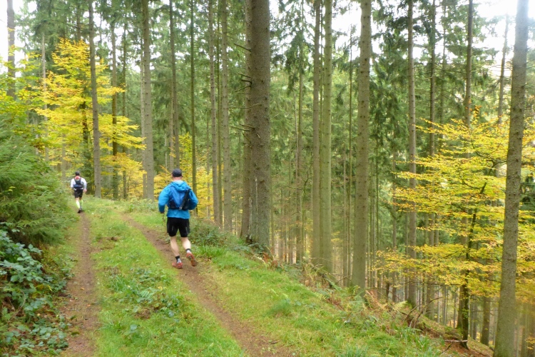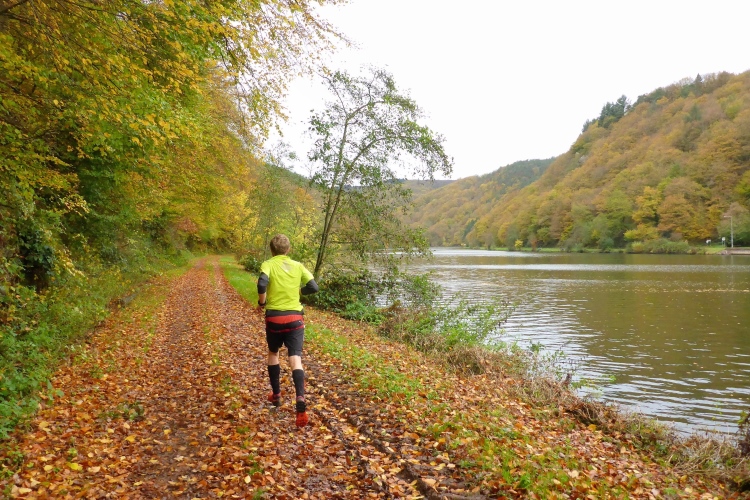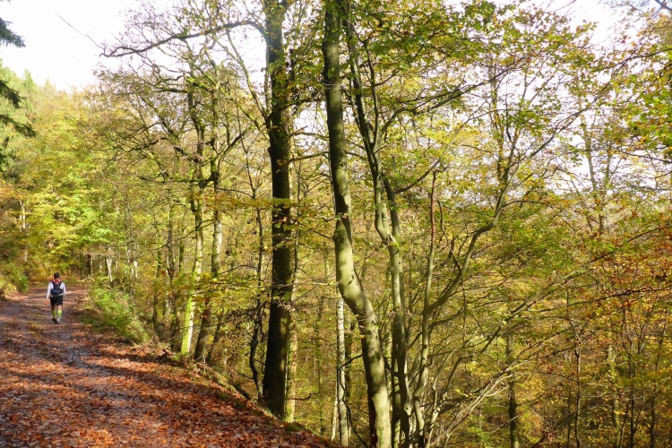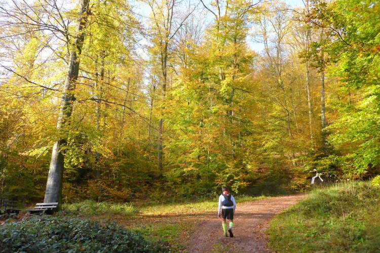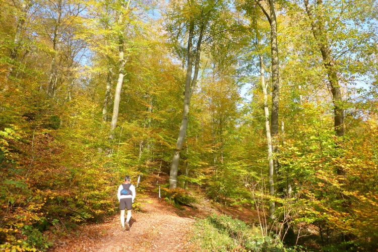 Es folgt ein schöner Trail-Aufstieg, danach kommen einige Kilometer auf breiten Wegen mit nur wenig Höhenunterschied, immer durch Wald mit viel buntem Herbstlaub. Der Trail bergab zur Saar macht wieder richtig Spaß.