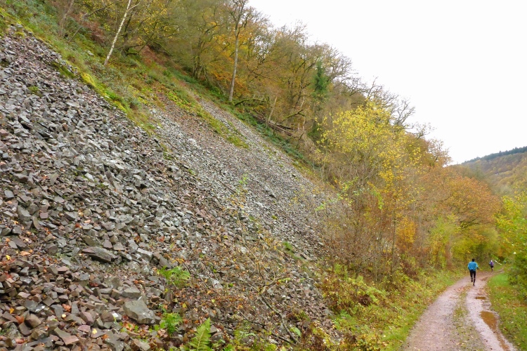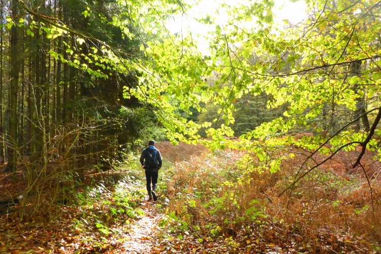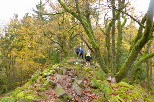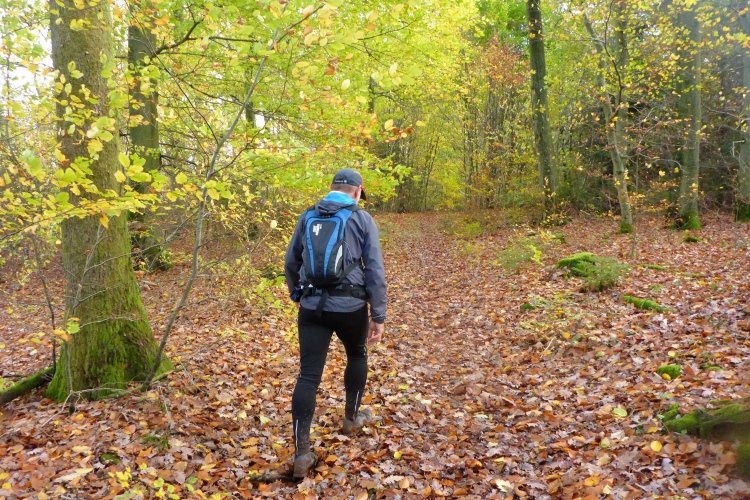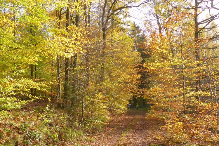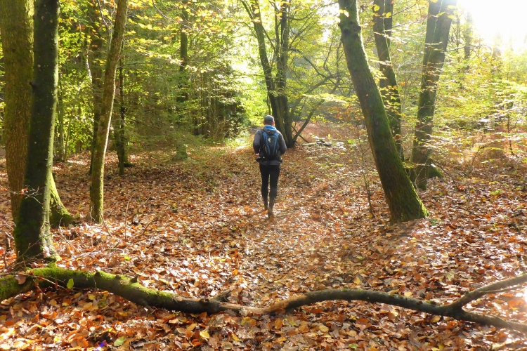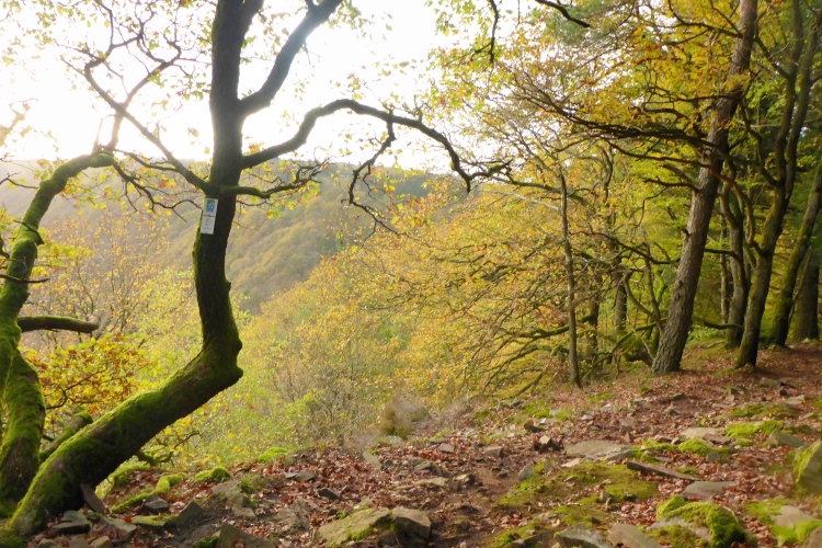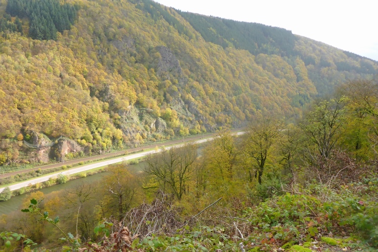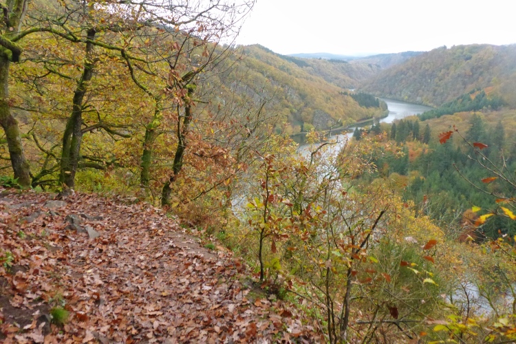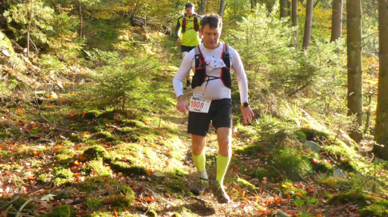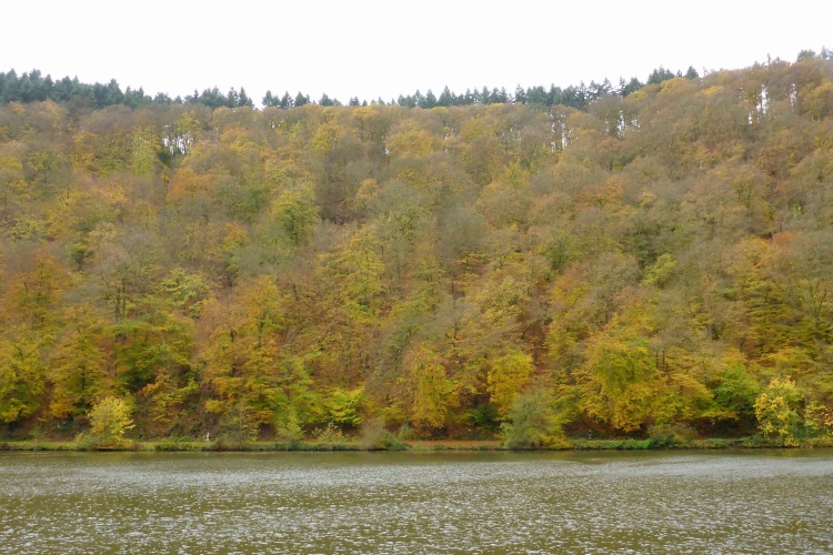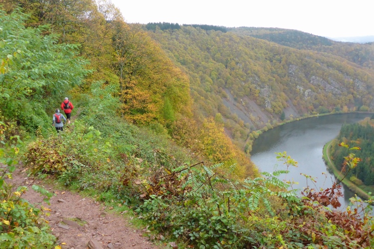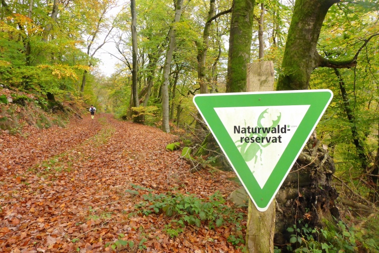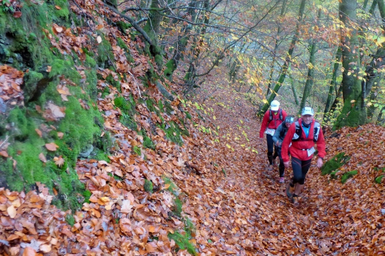 Es folgt ein schöner Trail-Aufstieg, danach kommen einige Kilometer auf breiten Wegen mit nur wenig Höhenunterschied, immer durch Wald mit viel buntem Herbstlaub. Der Trail bergab zur Saar macht wieder richtig Spaß.
