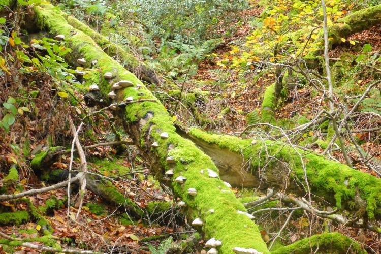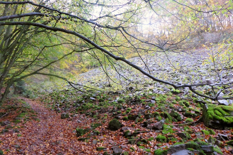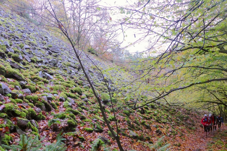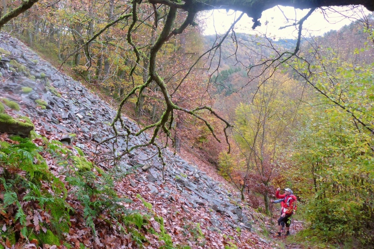 Dann steigen wir auf einem anfangs steilen Trail bergauf. Vorbei an einigen für diese Steilhänge typischen Schutthängen, bemoosten Steinen und uriger Vegetation gewinnen wir schnell an Höhe. Die Strecke gefällt mir bisher wieder außerordentlich gut.