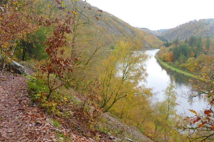 Nun geht es wieder auf teilweise herrlichen Trails hinab zur Saar. Im Gegensatz zu manch anderen Laufveranstaltungen, die das Wort Trail im Namen tragen, aber meist nur über Waldwege und einfache Pfade führen, gibt es hier wirklich jede Menge knackige Trail-Abschnitte, die Aufmerksamkeit erfordern. Für mich ist die Saarschleife das perfekte Trailrunner-Paradies. Ich sehe aber auch Läufer mit normalen Schuhen ohne Trail-Profil. Davon rate ich dringend ab, denn Geröll und Wurzeln werden auf den manchmal etwas rutschigen Trails von dichtem Laub bedeckt.