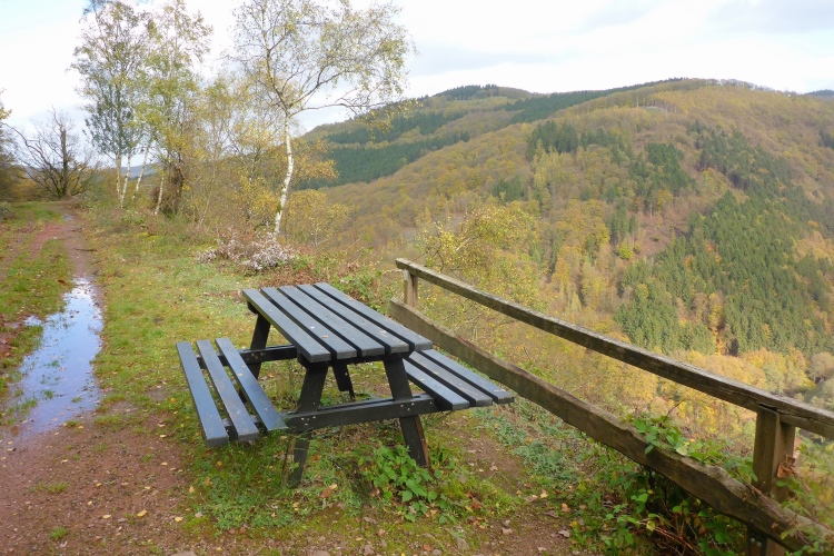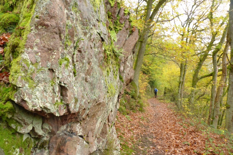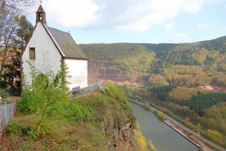 Zufrieden erreiche ich die Verpflegungsstelle vor der Michaelskapelle bei Taben-Rodt. Die auf einem Felsen über der Saar aufragende Kapelle aus dem 15. Jahrhundert bietet eine schöne Aussicht. Der Sage nach gelobte hier einst ein Ritter auf der Flucht dem heiligen Michael den Bau einer Kapelle, wenn er ihn retten würde. Dem Ritter gelang es, mit seinem Pferd unbeschadet vom Felsen in die weit unten fließende Saar zu springen und auf der anderen Seite zu entkommen. Ich will jetzt aber nicht zum Fluss hinab springen, sondern leichtfüßig dem Trail folgen.