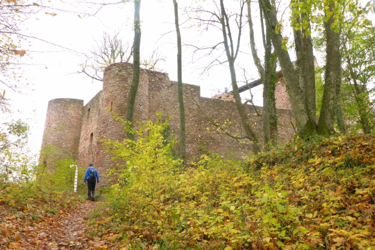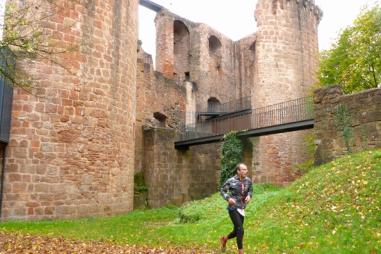 Oben umrunden wir die Ruine der Burg, die im 15. Jahrhundert auf den Resten einer noch älteren Burganlage erbaut wurde. Dann laufen wir auf breitem Fahrweg zur zweiten Verpflegungsstelle. Anschließend führt uns ein Trail hinab nach Mettlach.