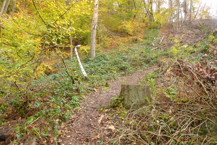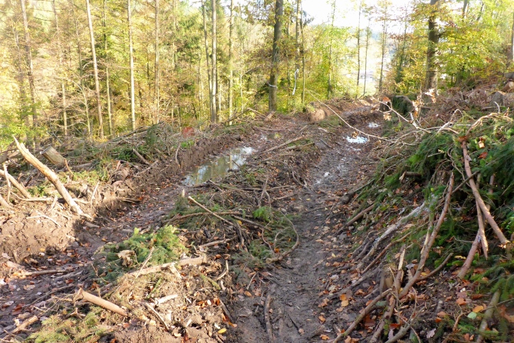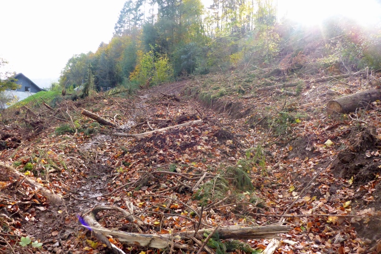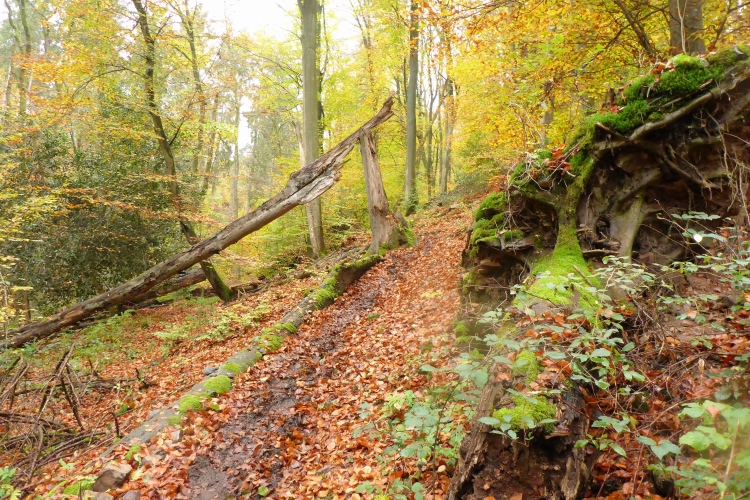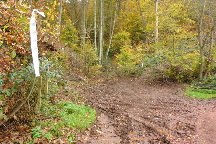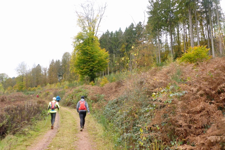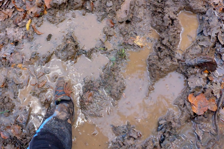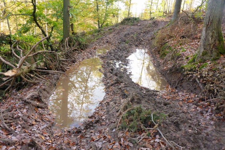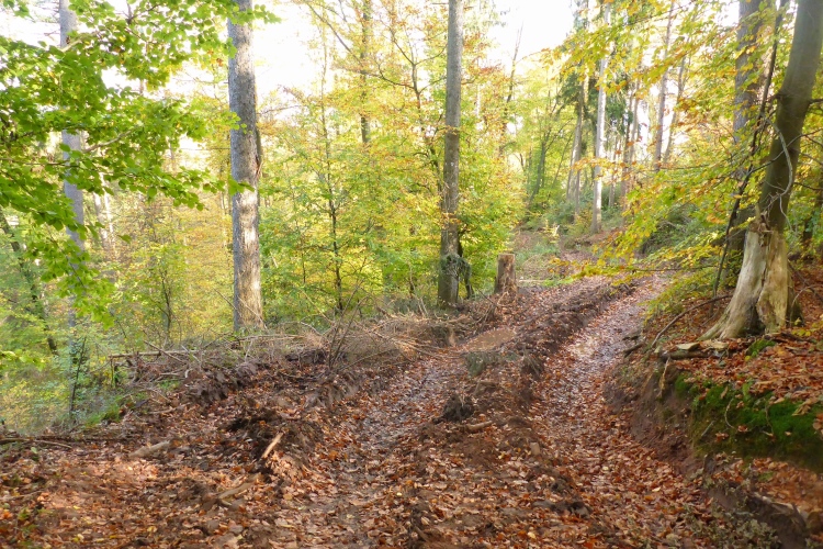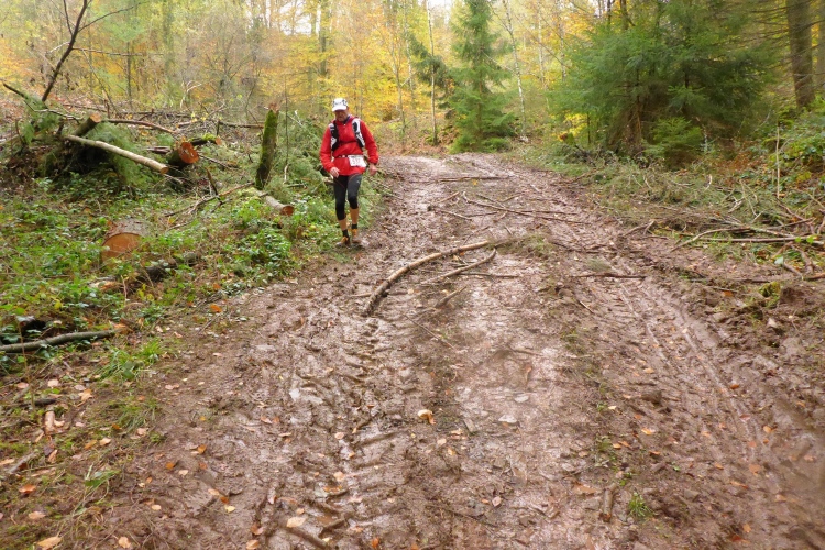 Nach einer kurzen Rast führt unsere Route nun weit weg von der Saar über viele breite Wege und einige Trails, vorerst ohne steile Auf- und Abstiege. Ich habe zwar meine Stöcke dabei, doch eigentlich braucht man sie nicht. Das letzte Stück hinab nach Keuchingen ist dann für einen Schlamm-Fan wie mich genial. Tiefe Fahrspuren haben den Weg in einen Parcours verwandelt, der zu jedem Action-Hindernislauf passen würde. Manchmal versinkt man regelrecht im Dreck. Klasse! So mag ich es!