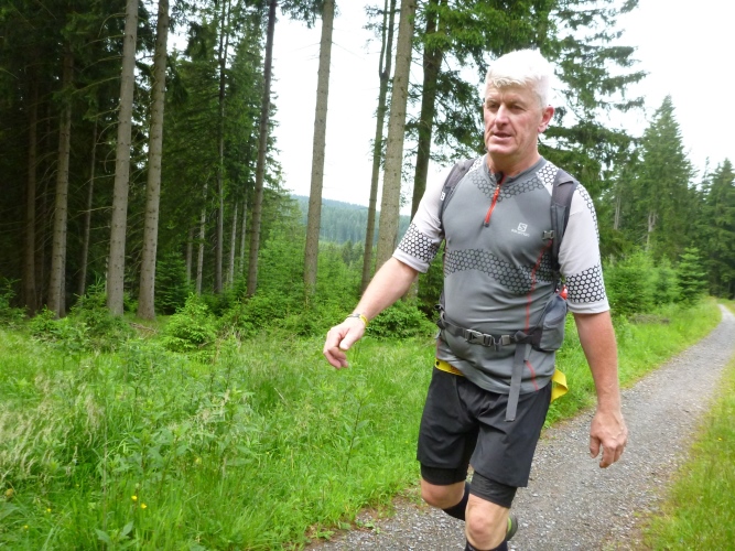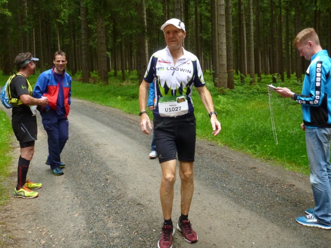 Kurz vor 12.00 Uhr erreiche ich dann den nächsten VP Dlouha cesta bei Kilometer 37. Einen guten Kilometer später überschreiten wir die Staatsgrenze und sind wieder dahaom. Wir haben nun den höchsten Punkt, knapp über 1000 Meter Seehöhe, bei Deutsches Gehau und Hubertky erreicht.