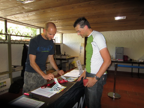 Bei der Registrierung in Garmisch-Partenkirchen erhalten wir eine Reisetasche (Volumen: 100 l), die mit unsere Startnummer bereits gekennzeichnet ist. In diese Tasche muss unser komplettes Gepäck für vier Tage - gleich die erste Herausforderung. Auch die Startnummer und Trailbooks erhalten wir hier. Da haben wir ja nochmal Glück gehabt, ich hatte schon Angst, wir bekämen anstelle einer Startnummer eine Ohrenmarke verpasst. Gut, vielleicht fänden das manche sogar dekorativ, so ein „Ohrring“. Der Viehhüter könnte auch mit seiner Digitalkamera Ohrmarken-Portraits und Ganzkörperaufnahmen seiner Herdenmitglieder vor dem Almauftrieb schießen und sie dann in seinem Laptop speichern, um sie im Ernstfall abrufen zu können. Vielleicht sollten wir das mal vorschlagen?