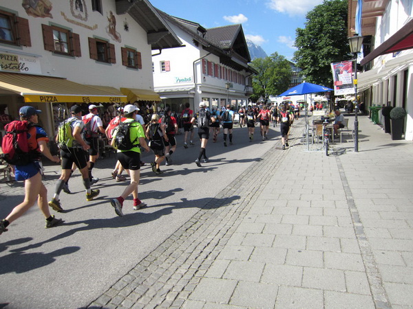 Auf den ersten Metern haben wir noch das unbeschreiblich schöne Gefühl der Leichtigkeit und der Schmerzlosigkeit. Im Moment laufen wir aus dem Ort so ca. 1,5 km eben auf Asphalt. Wir wissen, das wird sich ändern. Für heute hat uns der Tourismusdirektor von Garmisch und somit auch für Deutschland, wunderschönes Wetter vorhergesagt, auf 2.000 m etwa 20 Grad. Wie das die Kollegen dann morgen in Österreich hinbekämen, kann er nicht sagen, aber er meinte: „Wir Alpinen halten zusammen“.