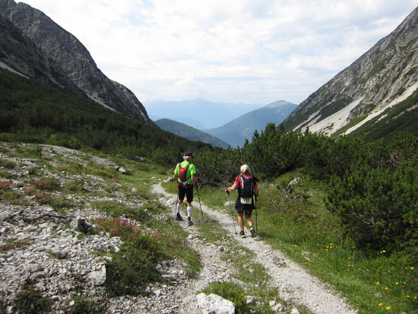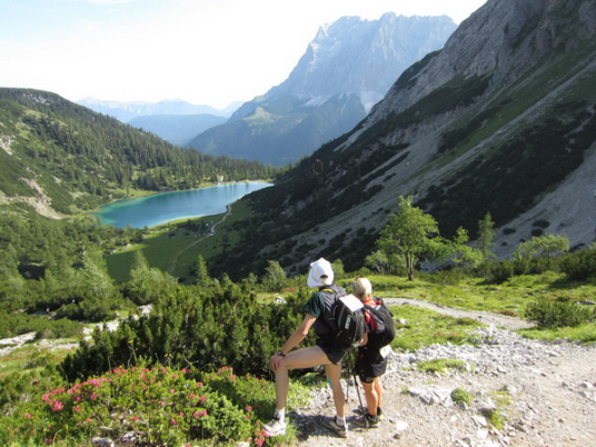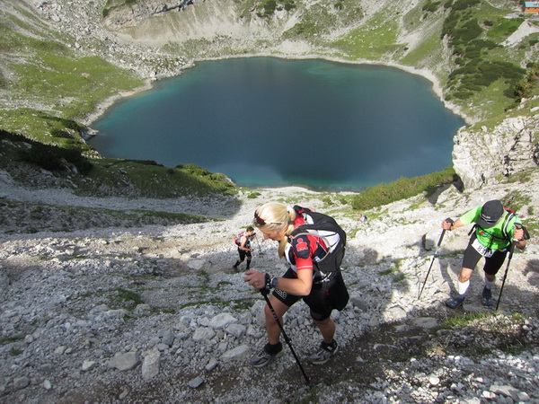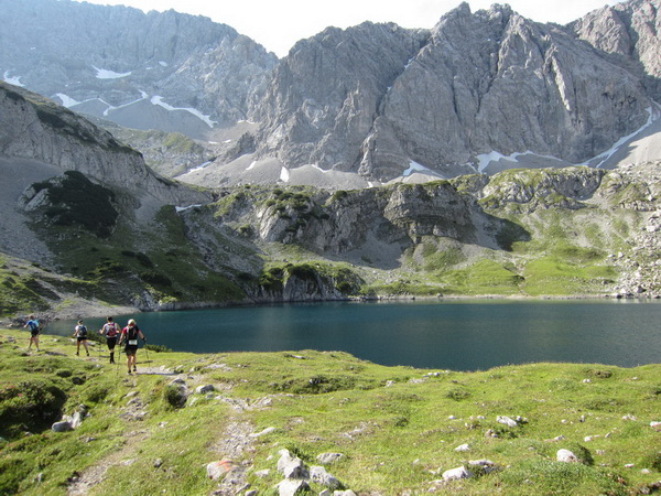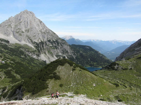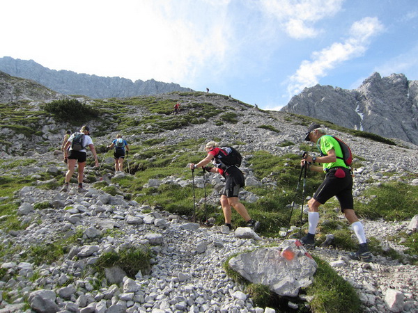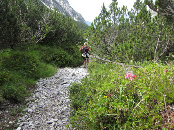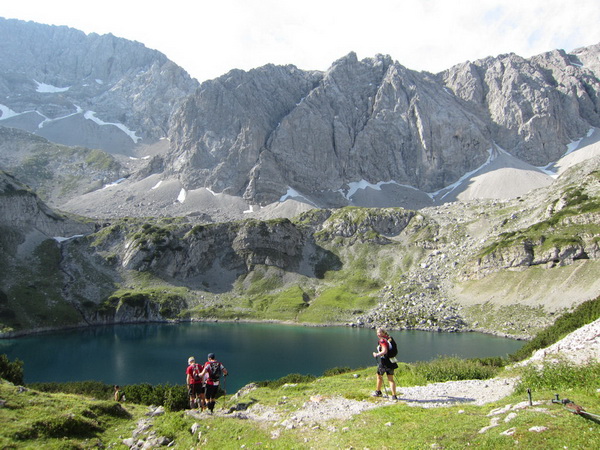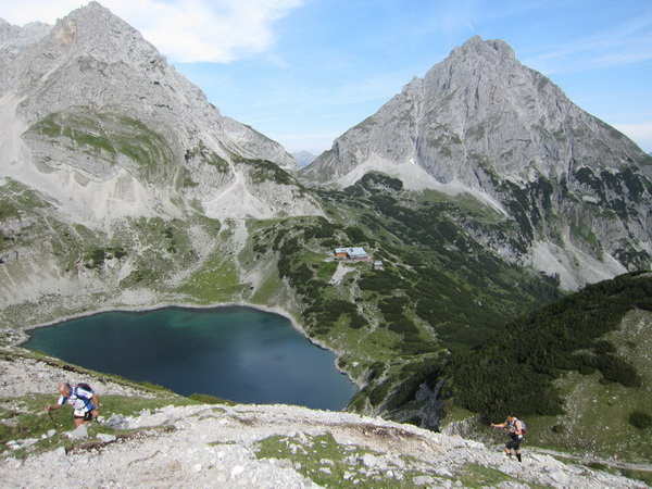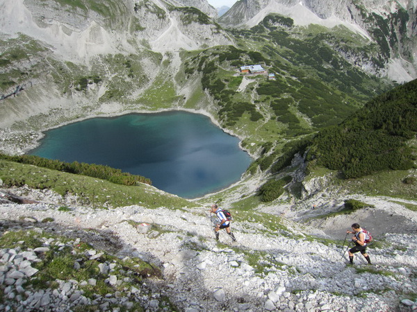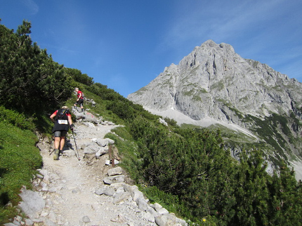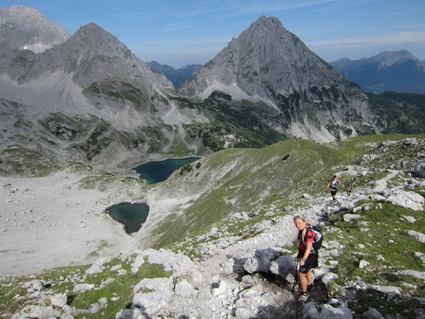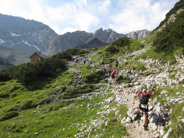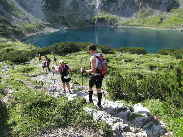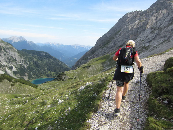 Die Rescue-Gruppe braust auf ihren Geländemaschinen vorbei. Wir laufen an der Ehrwalder Alm (1.502 m) vorbei. Ein Schild zeigt uns noch 500 Meter bis zur Verköstigung an, aber diese 500 Meter „ziehen“ sich. Etwa gegen 8:45 Uhr erreichen wir VP 1 am Seebensee, den schönsten See in diesem Gebiet. Wir sind etwa 1:20 Std. vor der Zeit. Dies ist auch wichtig, beginnt doch mit der Durchquerung des Mieminger Gebirges der erste Höhepunkt bei der Überschreitung der 2.272 m hohen Grünsteinscharte.