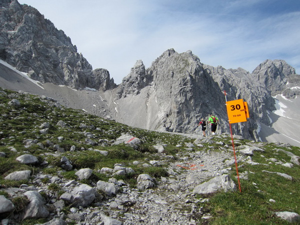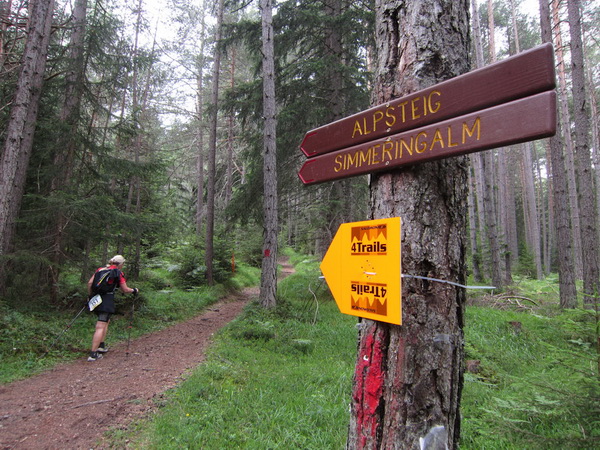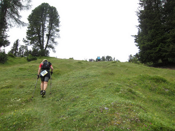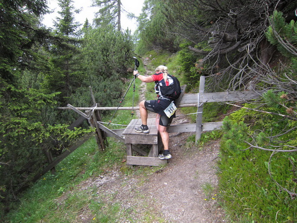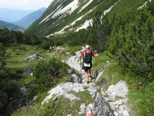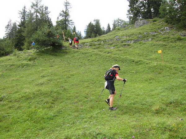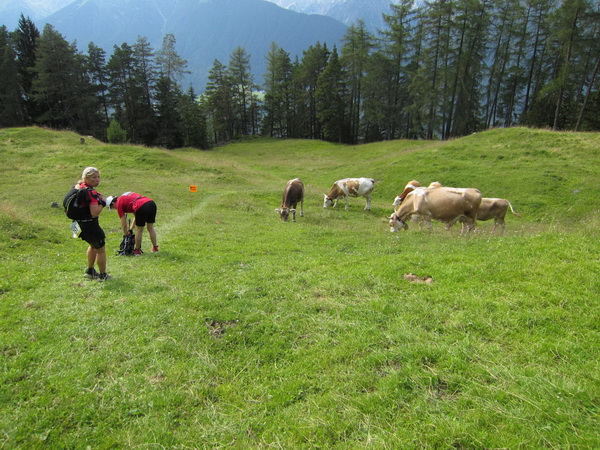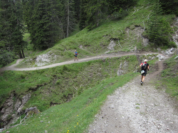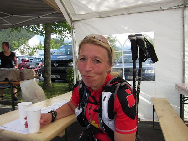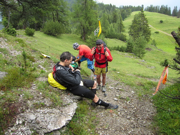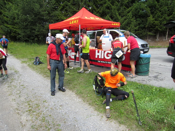 Auf den Weg zum letzten VP 3 geht es abwärts bis zur Karröster Alpe (1.467 m) die wir um 16:35 Uhr mit einem Hungerast erreichen. Von V2 bis V3 haben wir genau 5 Stunden, in Worten FÜNF, gebraucht. Wie weit ist es noch bis ins Ziel? Aufgeben? Im wahrsten Sinne des Wortes eine Grenzerfahrung. Wer schneller ankommt, kann sich länger erholen - wir leider nicht.