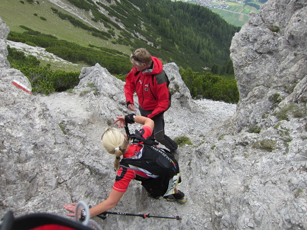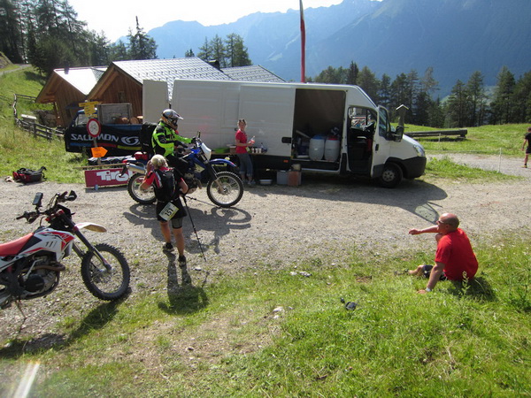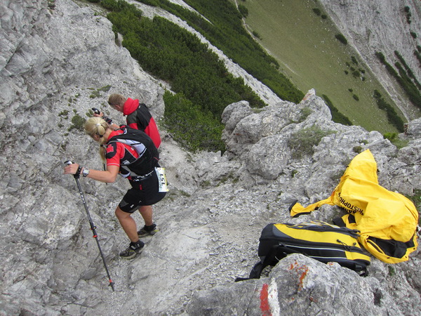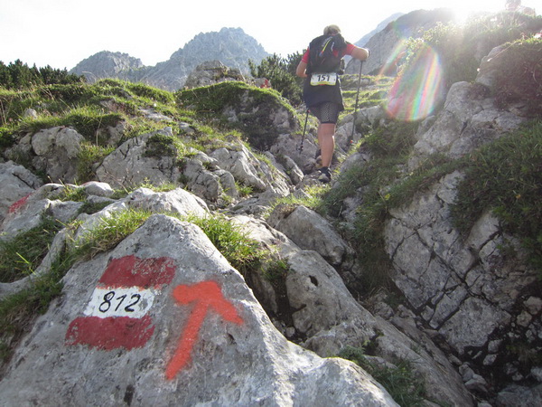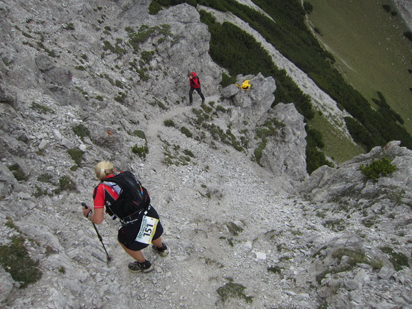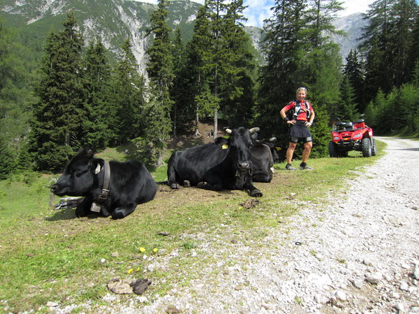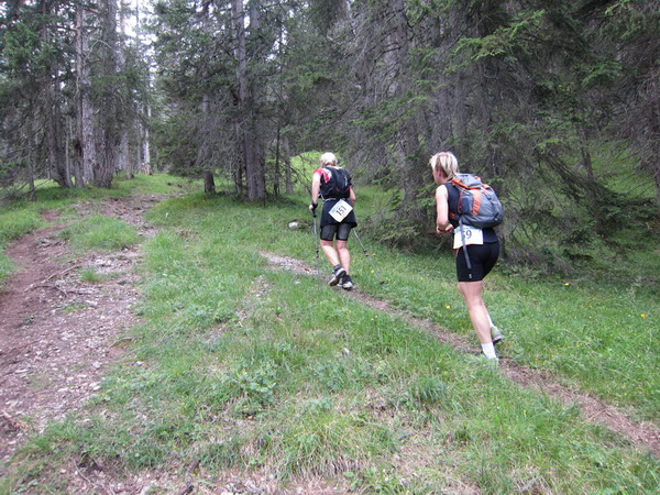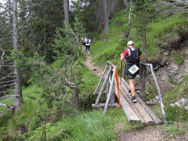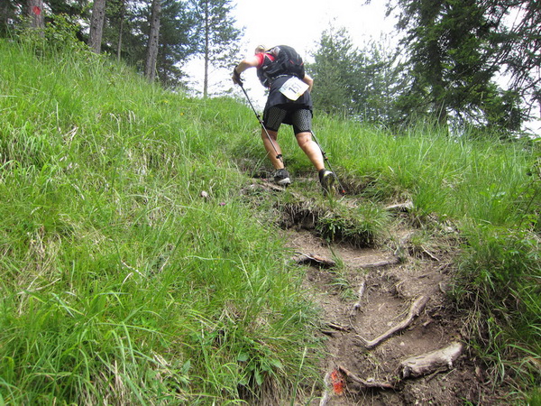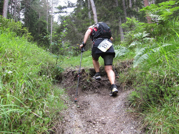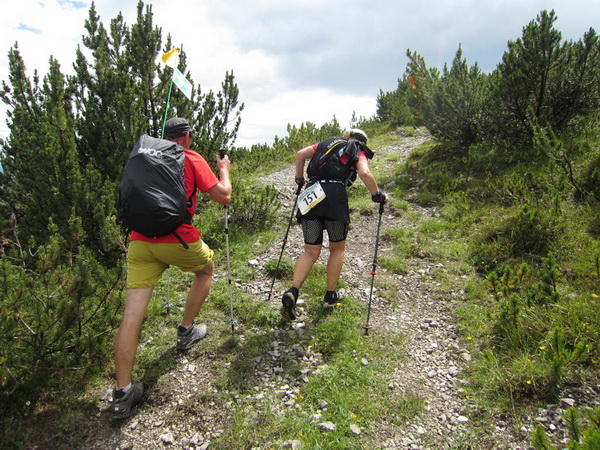 Auf den Weg zum letzten VP 3 geht es abwärts bis zur Karröster Alpe (1.467 m) die wir um 16:35 Uhr mit einem Hungerast erreichen. Von V2 bis V3 haben wir genau 5 Stunden, in Worten FÜNF, gebraucht. Wie weit ist es noch bis ins Ziel? Aufgeben? Im wahrsten Sinne des Wortes eine Grenzerfahrung. Wer schneller ankommt, kann sich länger erholen - wir leider nicht.