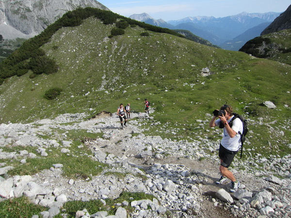 Stück für Stück schrauben wir uns weiter nach oben in Richtung Coburger Hütte. Ein Fotograf bringt uns doch immer wieder zum Lächeln. Stefan Schlett, der Genießer, überholt uns, gemeinsam bewundern wir nur kurz die Aussicht. Wir kommen an die Coburger Hütte und begeben uns dort weiter Richtung „Hoher-Gang“ der nur für geübte begangen werden sollte. Die Spannung steigt und wir auch weiter und weiter. Der Ausblick wird immer grandioser.