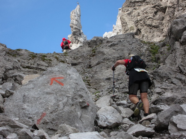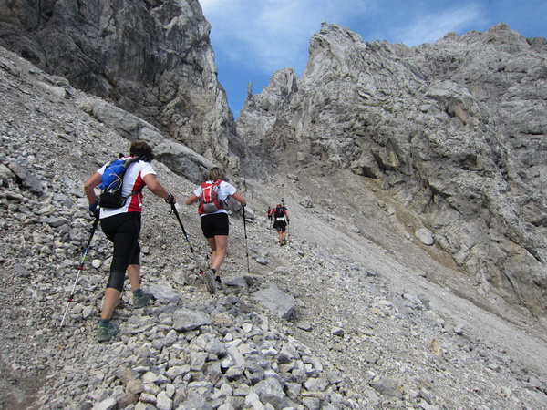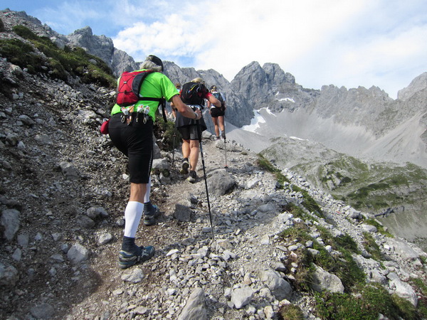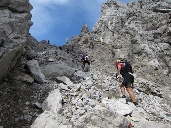 Jetzt gilt es, Ruhe zu bewahren: Wir müssen möglichst hintereinander die Schlüsselstelle überwinden, wer drängelt, führt sich selbst zur Schlachtbank. Nur gut, dass das Wetter hält. Diese Etappe ist eine Herausforderung, auch für Bergsteiger und erst recht für uns „Flachland-Hessen“. Aber mit unvergesslichen Eindrücken. Nicht sonderlich elegant mit diesen steifen Knochen hangeln wir langsam abwärts. Ein Ringen um Gleichgewicht, bei dem sich neue Horizonte auftun. Es macht richtig Spaß.