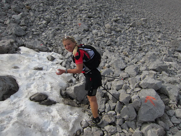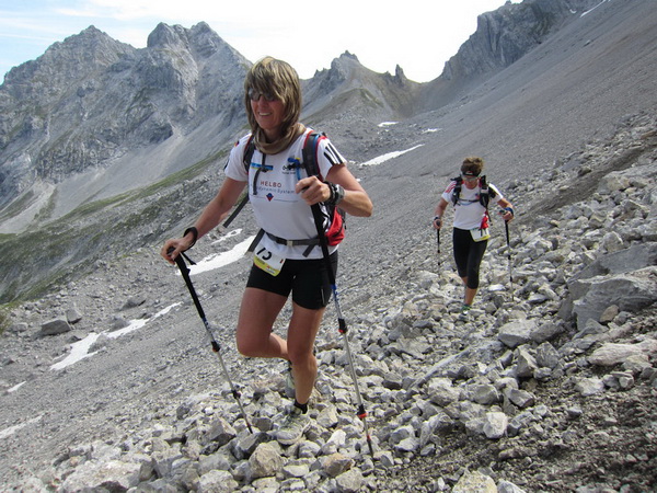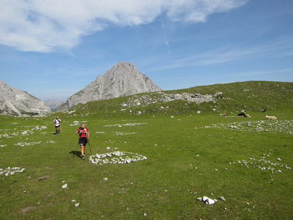 Noch 30 km to go. Wir erklimmen entlang einem langen Schotterhang einen Grad. Vor uns kleben ein paar Läuferpunkte, klein und greifbar. Da kommen auch Christina und Claudia, auch sie laufen wie wir immer dicht zusammen. Auch die Bergschafe bewältigen die oft langen und schwierigen Wegstrecken in die Höhe gemeinsam.