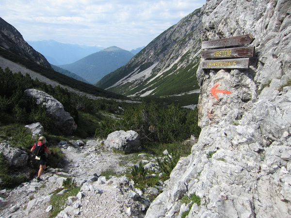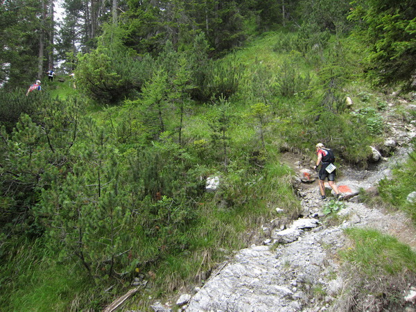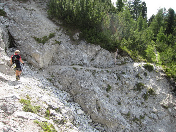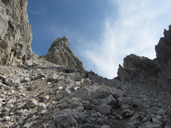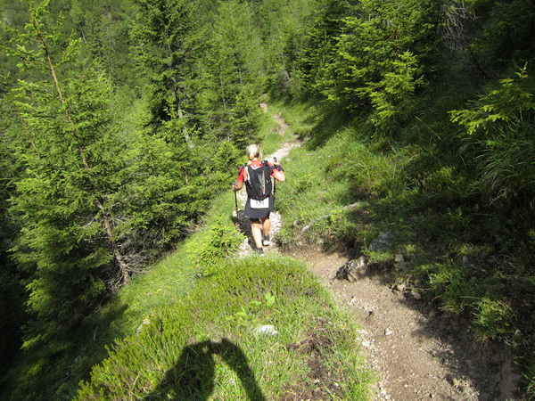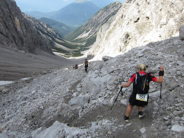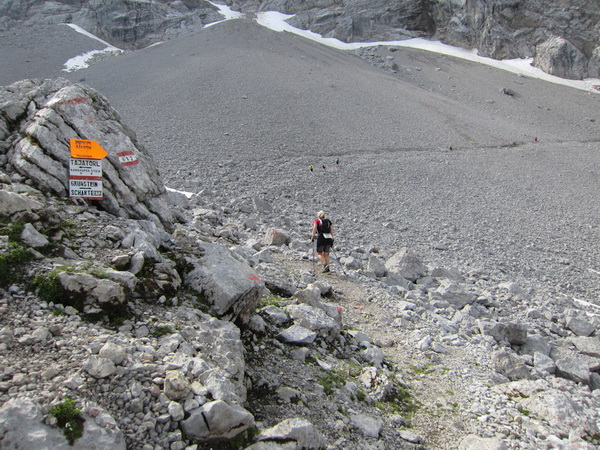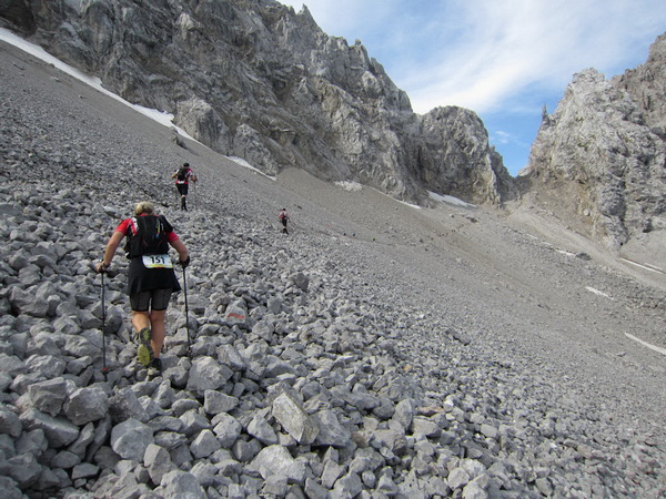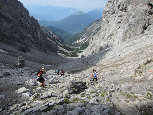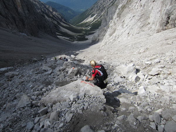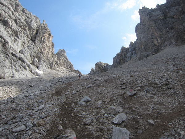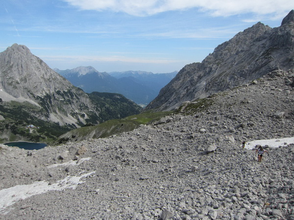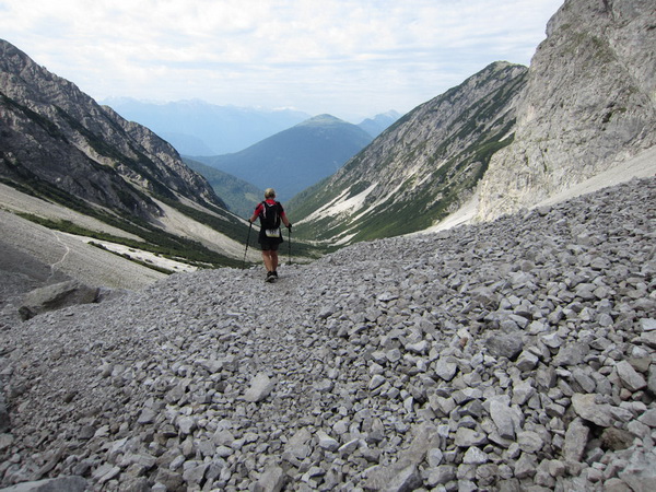 Es geht nun in losem Geröll lang und steil bergab. Sicherlich im Winter eine schwarze Piste. Aber nicht nur ich brauche lange an diesem Hang. Ebenso wie Kletterer gibt es Ablaufspezialisten. Ich liebe auch das Abwärtslaufen, es ist genauso wie Skifahren. Man muss immer beweglich bleiben, nie die Beine anspannen, die müssen wie Stoßdämpfer funktionieren. Funktioniert bei mir hier leider nur in der Theorie. Schmerzen in den Füssen.