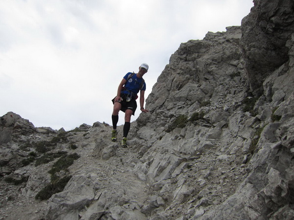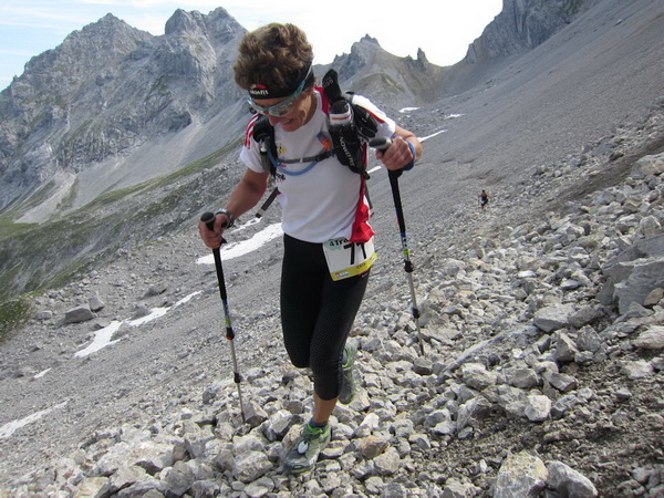 Andrea überholt uns an der Verpflegungsstelle. Nach rund 34 Kilometer klettern endlich wieder auf ebenen Boden. Ich laufe wie im Rausch. Genau das ist meine Medizin, genau dieses Gefühl. Noch 3 Kilometer bis ins Ziel. Wir schließen zu anderen Läufern vor uns auf. Da ist auch Andrea. Ich rufe ihr zu: „Los, wir schaffen das noch, wir haben noch 15 Minuten und es geht bergab“!