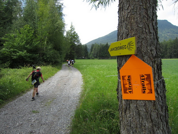 Ein altes Holzschild zeigt den Weg zum Lehnberghaus. Das ist auch unsere Richtung. Noch 26,5 Kilometer. Nach der Unterführung einer Bundesstrasse erreichen wir um 11:35 Uhr auch den nächsten Verpflegungspunkt (V2). Bis 12:30 Uhr lautet hier die Zeitvorgabe. Schnell Wasser in die Getränkeblase, etwas Salz, etwas Magnesium, etwas Käse, etwas Melone, etwas Kuchen und schnell den beiden Mädels C + C hinterher. Noch mit vollem Mund laufen wir, natürlich wieder aufwärts, ein Stück am Jacobsweg entlang.