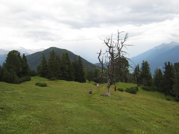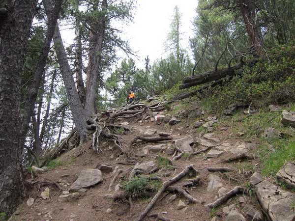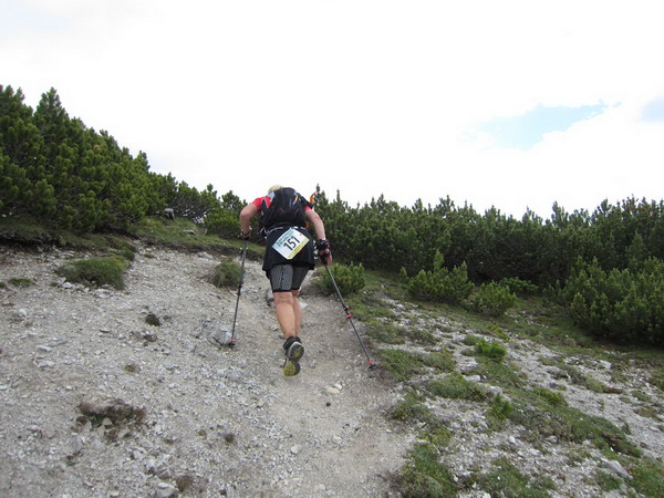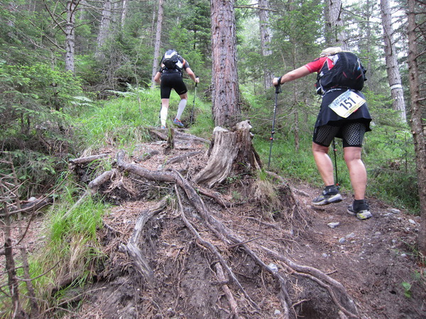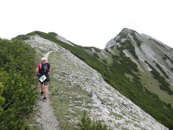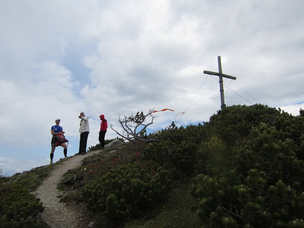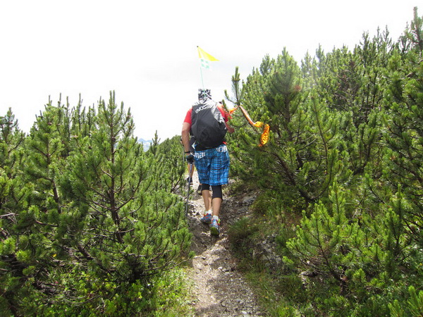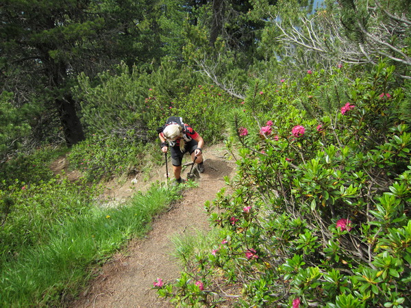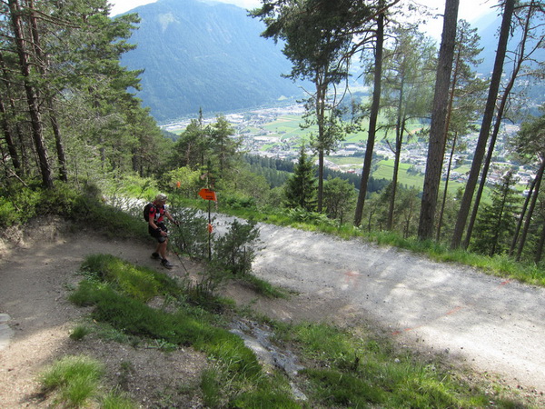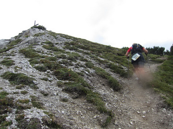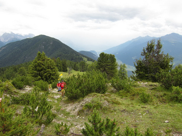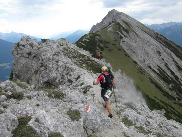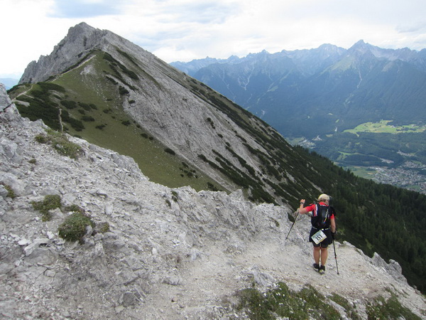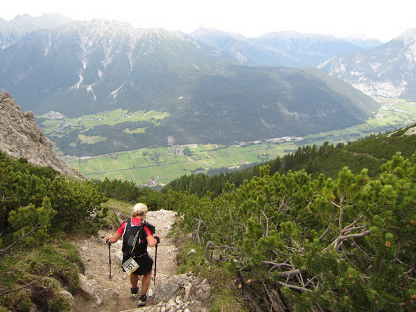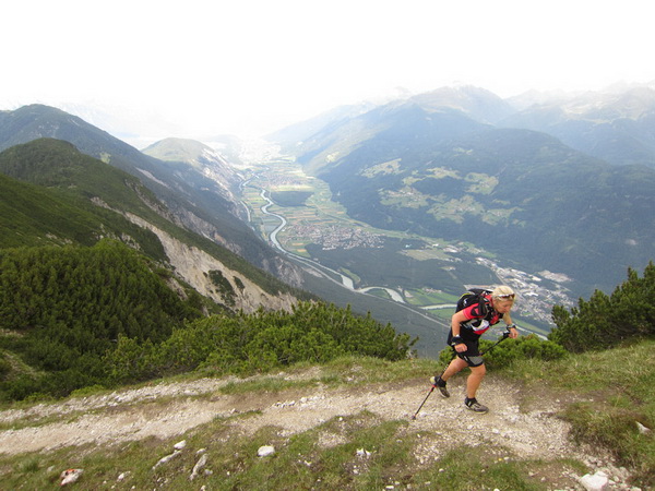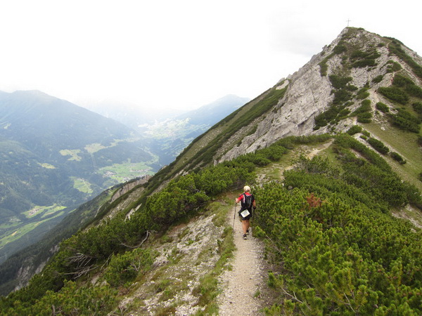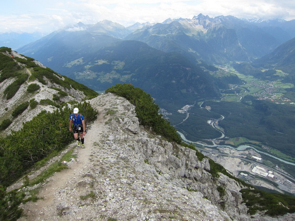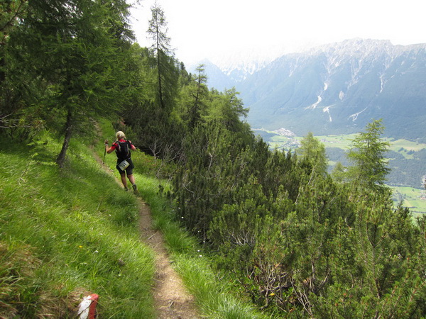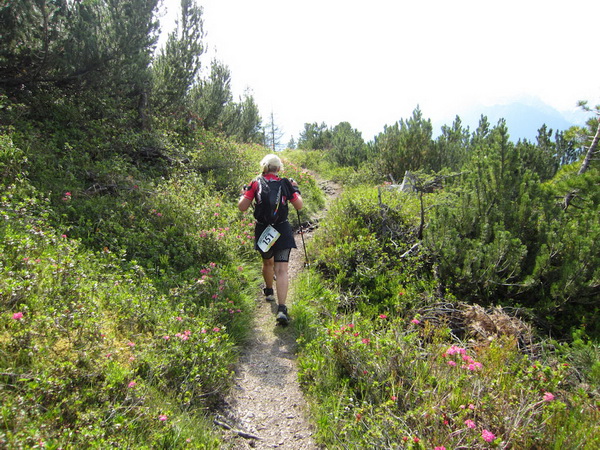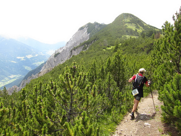 Nach einem neuerlichem Aufstieg von Finsterfiecht (1.040 m) gibt es ein Wiedersehen mit einem Läufer, nach über 2 Stunden. Dann können die anderen auch nicht mehr weit sein. Wir überholen einen weiteren Läufer. Er hat seine Kraft und seinen Willen verloren. Im Aufstieg wandelt sich wieder die Vegetation. Wir sehen das Gipfelkreuz, dort müssen wir hoch. Die Getränkeblase gibt schon lange kein Wasser mehr. Der Aufstieg bis hierher war zu lang und zu beschwerlich in dieser Hitze. Wir laufen über traumhafte Panoramatrails hoch über dem Inntal bis kurz unter den Tschirgant (2.370 m).