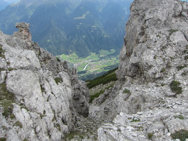 Kurz vor dem höchsten Punkt der hochalpinen Überquerung erreichen wir die engste und auch gefährlichste Stelle des Tages. Hier sind vor ein paar Jahren einige Schafe bei eisigen Verhältnissen abgestürzt. Sie sind dort unten mit dem Buckel gegen die Steinplatten gedonnert. „Wir mussten sie noch an Ort und Stelle abstechen“, bekommen wir vom Bergführer erzählt.