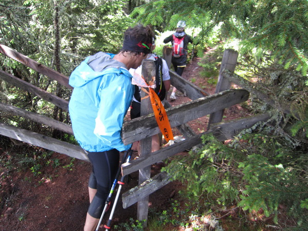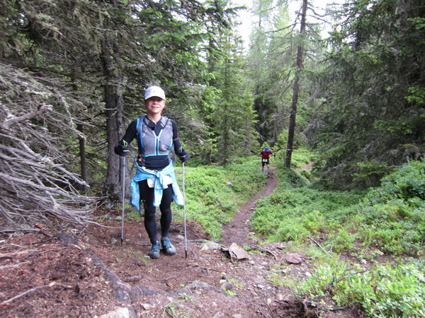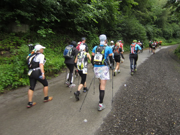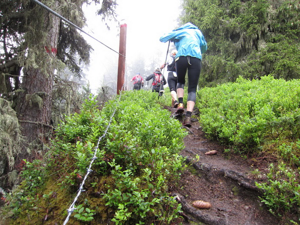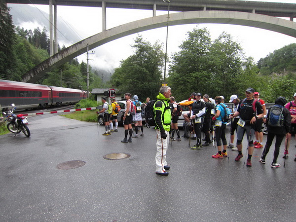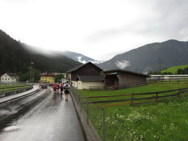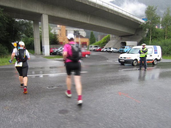 Die Führungsgruppe hat die Bahnschranke noch bei Rot genommen. Die Führenden laufen um ihre Platzierung, wir um unser Zeitlimit. Trotzdem ganz ruhig bleiben und mentale Stärke demonstrieren. Wir laufen hoch, das Wasser runter, einiges macht sich als Gebirgsbach davon. Einiges davon bleibt in unseren Schuhen und Socken, ein günstiger Nährboden für Blasen wie sich später noch zeigen wird. Österreich und die Schweiz sind in eine kalte grenzenlose Regenwolke verpackt.