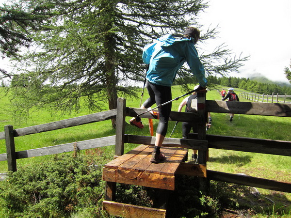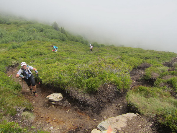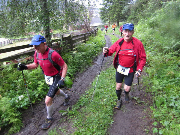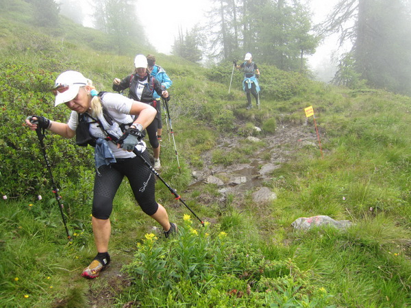 Der Nebel macht auch die Steine rutschig. Schon rutscht Kay ohne Vorwarnung an einer völlig harmlos aussehenden Stelle aus, weil er abgelenkt ist. Wir sind froh, dass noch alle Knochen dran sind. Die Handys haben wir für den Notfall dabei, aber hier sind doch viele Funklöcher. Wahrscheinlich hätte uns in einer Notsituation nicht einmal ein herzhafter Jodler genutzt, da er von sämtlichen Gegenhängen als schallendes Echo beantwortet würde.Die wenigsten Läufer haben den Vorteil, mit einem Partner den Wettkampf absolvieren zu können. Das gibt doch mehr Sicherheit .