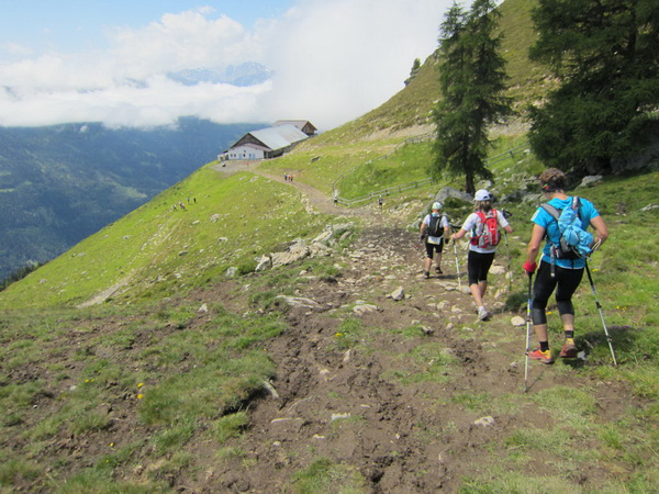 Auf Höhe der Hochaster Alpe orientieren wir uns Richtung Venetalphütte (1.995 m). Dort vorbei, laufen wir zur Entspannung der Muskulatur und der Knie kurz auf einer Forststrasse weiter. Schon wieder sind wir auf einem Steig unterwegs und es geht meist am Kamm weiter bis zum mit 2.512 m höchsten Punkt dieser Etappe, dem auch als Glanderspitze bekannten Venetgipfel.