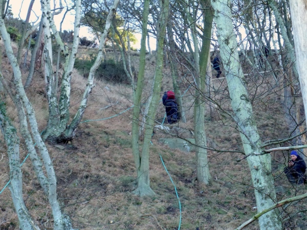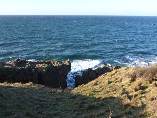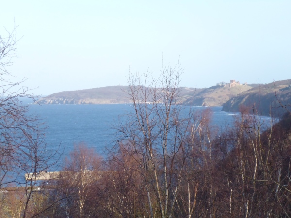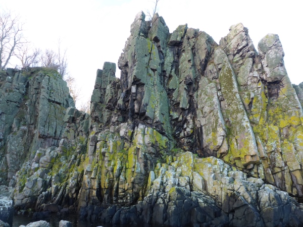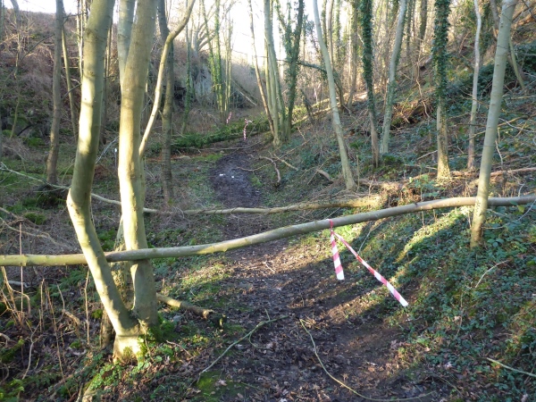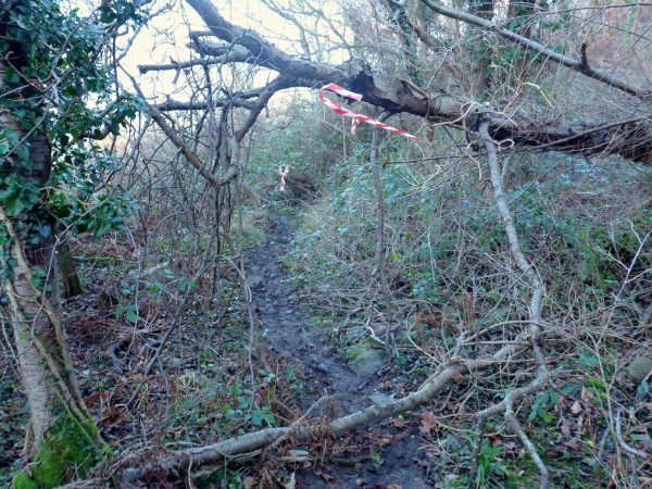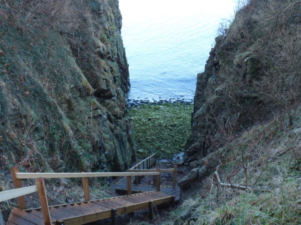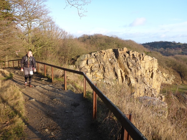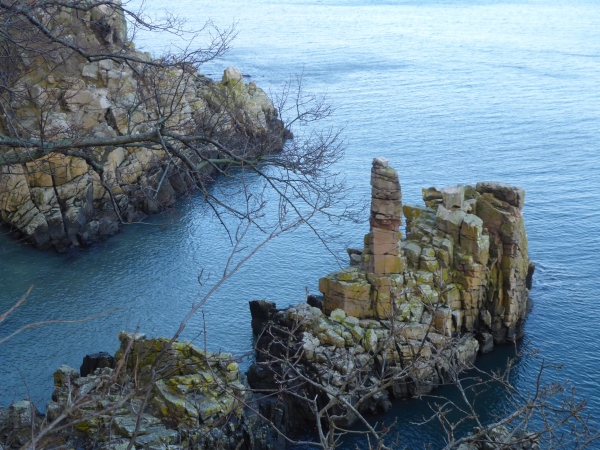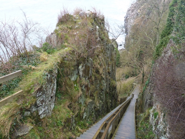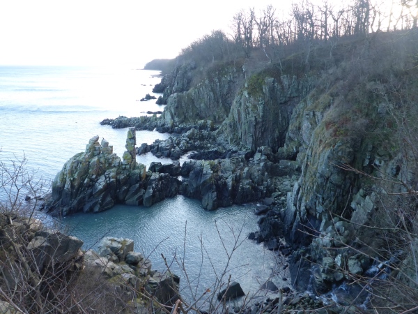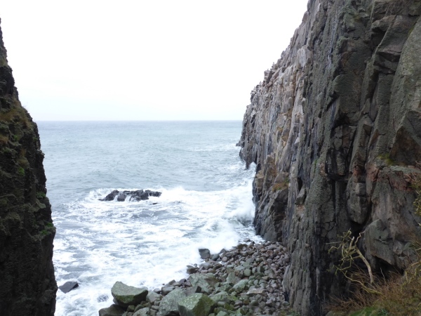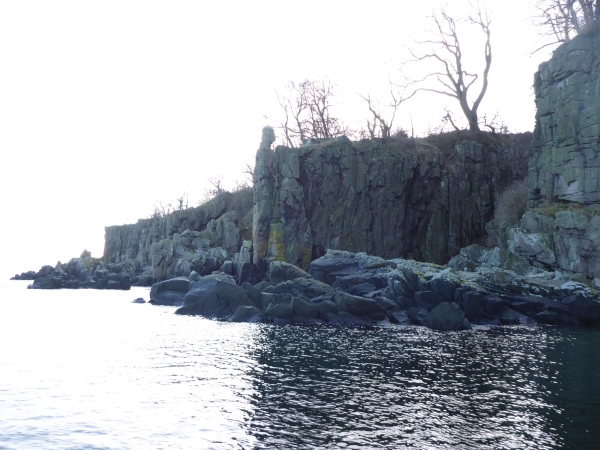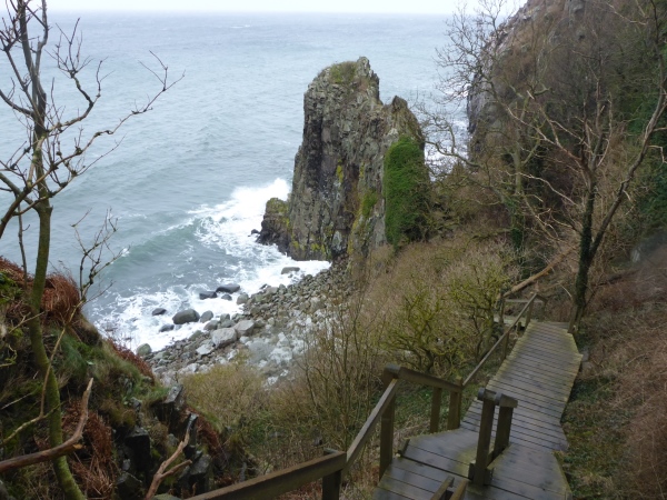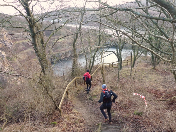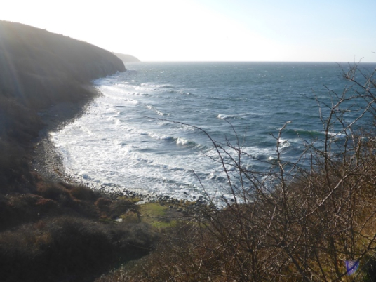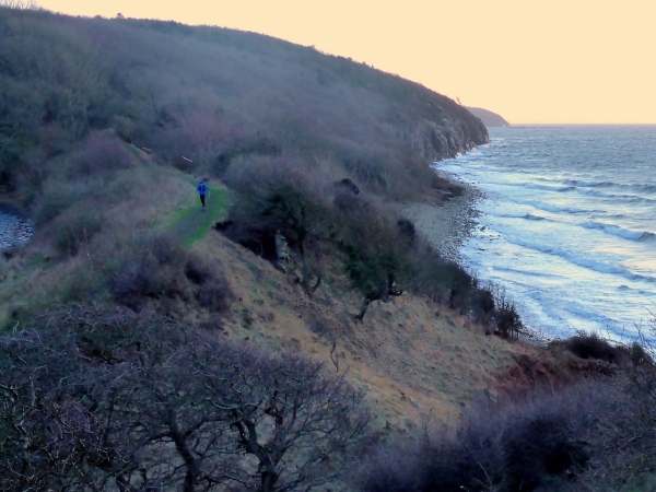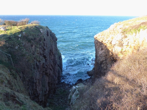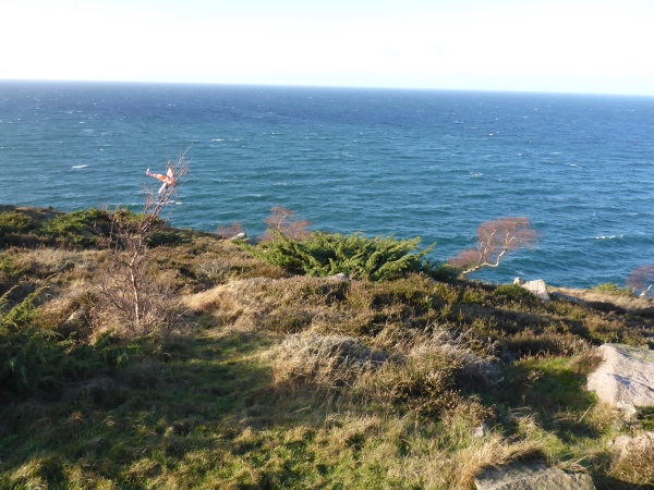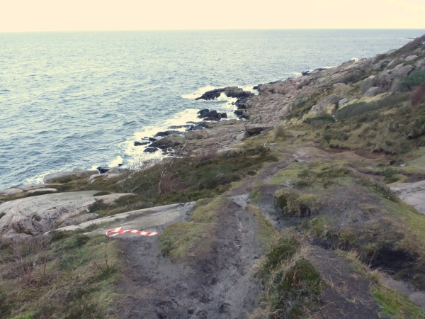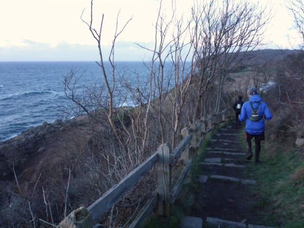 Kurz laufe ich durch den oberen Bereich des Fischerdorfes Vang. Dann erreiche ich einen weiteren Steinbruch, bei dem in einem See viele Schwäne schwimmen. Um 11:15 Uhr überholt mich der erste Marathoni. Durch eine kleine, urwaldartige Schlucht führt ein ruppiger Trail hinab zum Meer. Mehrmals müssen wir über umgestürzte Bäume steigen. Dann geht es hinauf zur Steilküste, der wir für kurze Zeit folgen.