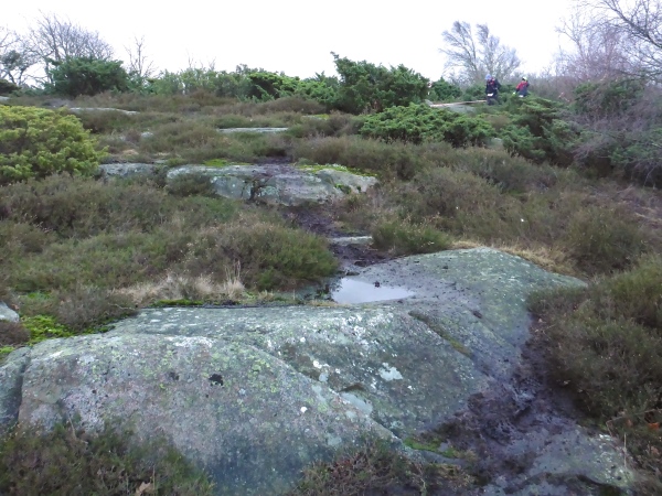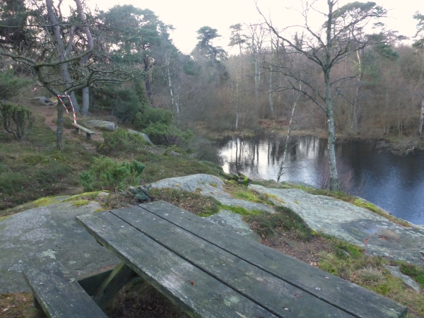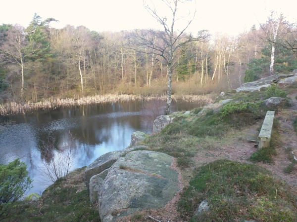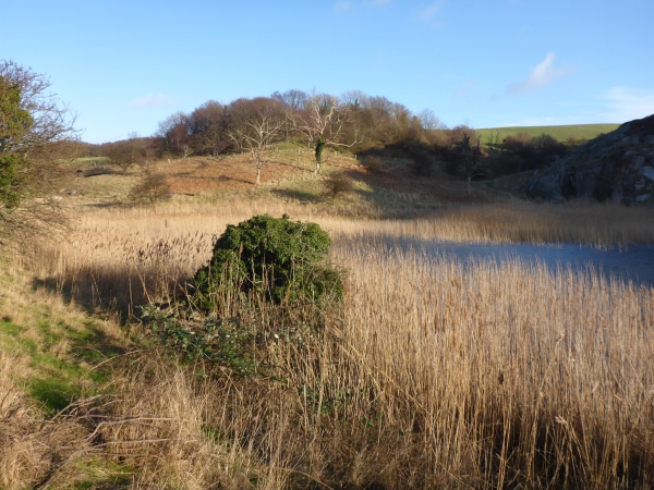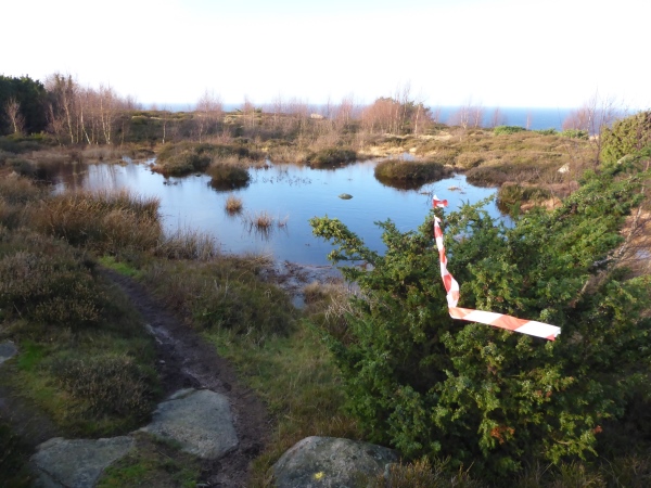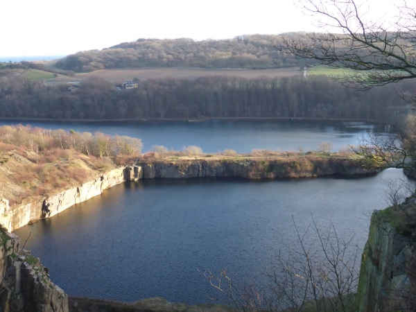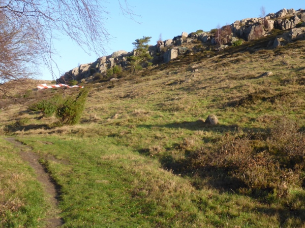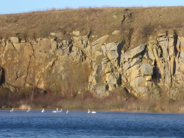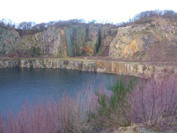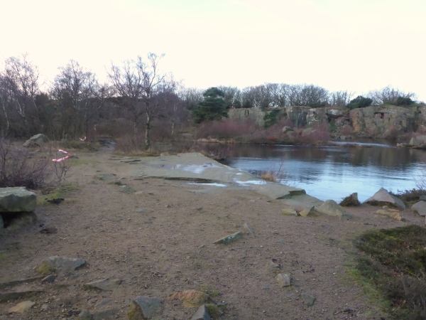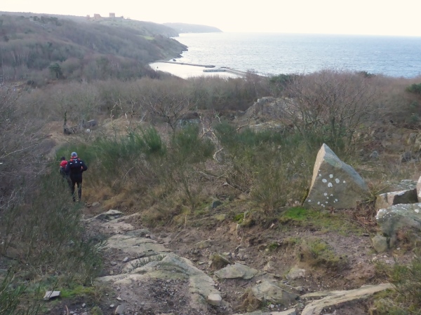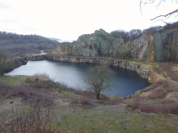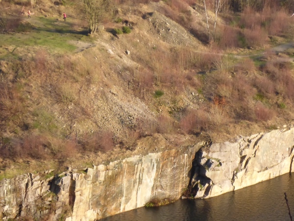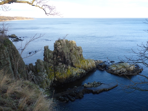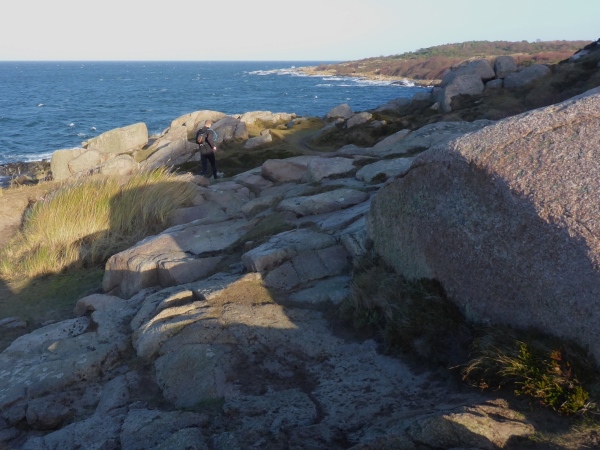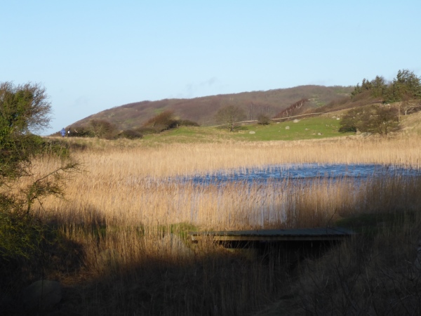 Dann erreiche ich Hammersø, den mit 10.000 qm größten See der Insel. Im Gegensatz zu vielen anderen Seen hat er einen natürlichen Ursprung. Viele andere, meist kleine Seen, sind Relikte ehemaliger Kohle- oder Tongruben. Bei einem sehr großen Steinbruch, an dem früher Granit abgebaut wurde, laufen wir auf der einen Seite über Treppen zur oberen Abbruchkante hinauf, dieser entlang und auf der anderen Seite einen steilen Trail hinunter.