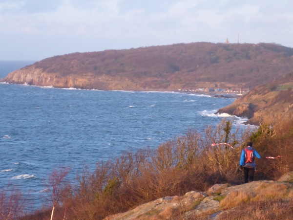 Unterhalb der Ruine Hammershus laufen wir auf Hammerhavn zu, noch immer auf wunderschönen Trails mit Blick hinab zu kleinen, felsigen Buchten. In Hammerhavn überquere ich die Zeitmessmatte, die Verpflegungsstelle ist windgeschützt im Zelt, wo auch unsere Drop-Bags liegen. Nach der ersten Runde gibt es hier recht wenig Auswahl an Verpflegung, nach der zweiten Runde gute und nach der dritten sehr gute. 18 km habe ich schon geschafft, nun folgen die sonnigen Runden!