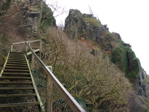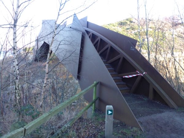 Auf einer seltsam gestalteten Brücke überquere ich eine Schlucht. Diese Brücke wurde im Jahr 2002 von dem Künstler Peter Bonnen entworfen und anlässlich des Landestreffen des Dänischen Gymnastikverbandes errichtet. Ich kapiere zwar nicht, was die Brücke mit dem Verband zu tun hat, aber egal.