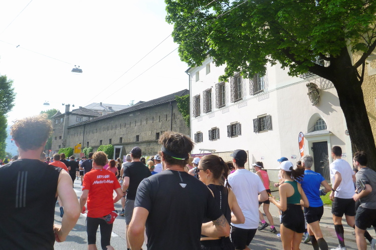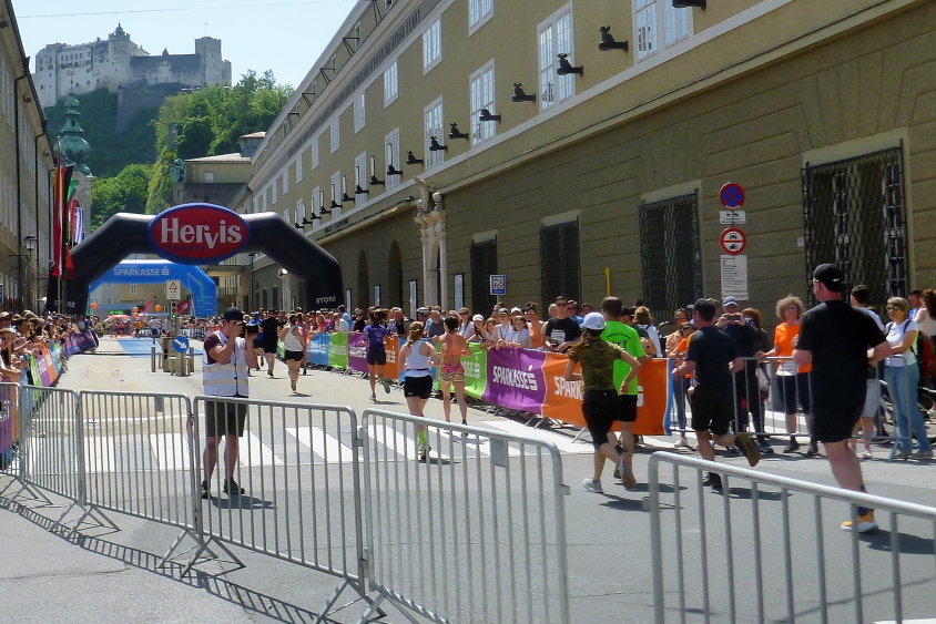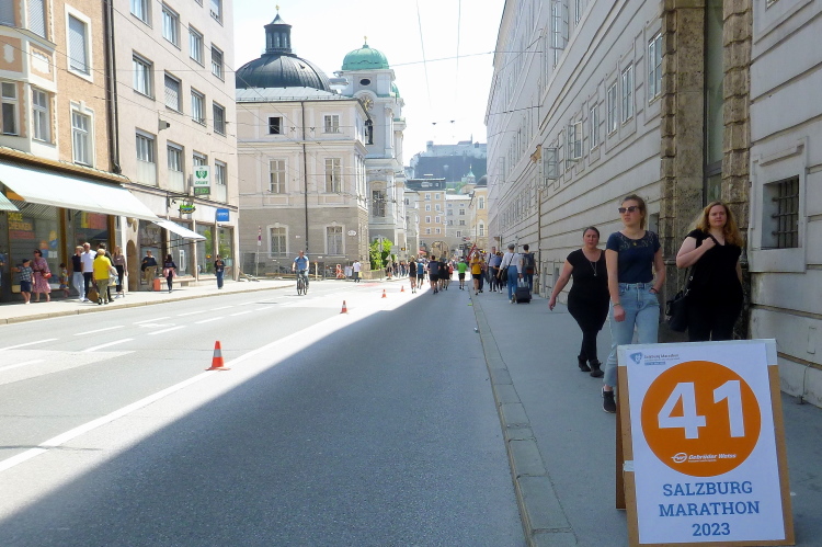 Auf geht es in die zweite Runde, wir sind „just in time“, die beiden Pacer machen ihre Aufgabe sehr gut und ich werde mich in Kürze entscheiden, bei denen bleiben oder mich nach vorne verabschieden. Zuvor geht es über den Universitätsplatz zum Domquartier mit der Franziskanerkirche und dem Dom zu Salzburg, der dem Hl Rupert und Virgil geweiht wurde. Auffallend ist, dass das Gotteshaus mit weißem Marmor, ein Kalkstein aus dem Untersberg, verkleidet wurde. Eigentlich müsste ich hier für eine mehrstündige Besichtigung des Historischen Zentrums der Stadt Salzburg mein Rennen unterbrechen. Aber wie so oft, werde ich diese Aufgabe wieder mit nach Hause nehmen in der Hoffnung, eines Tages diese abzuarbeiten.