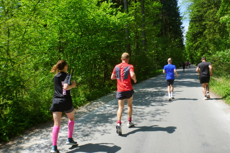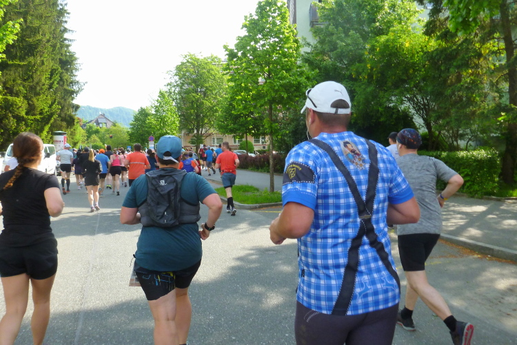 Wir verlassen den Kai an der Salzach und laufen nun nach gut einen Kilometer am Sportgelände der Sportunion Salzburg vorbei (dort kann nach dem Rennen geduscht werden). Noch sind die Schatten der Bäume an der Hellbrunner Straße und am Botanischen Garten sehr lang, aber die Temperatur beträgt jetzt schon etwa 20 Grad, der heutige Tag könnte sich zu einer Hitzeschlacht entwickeln. Wie so häufig in den letzten Jahren dauert die Übergangszeit von kalt auf warm nicht lange, einstellen kann sich der Körper da nur sehr langsam. Es wird heute wichtig, viel Flüssigkeit aufzunehmen und sich zu kühlen, wo immer es geht. Ich versteh einige Zeitgenossen nicht, die jetzt noch mit langen Laufhosen und langen Shirts umherlaufen, einer hat sogar noch eine gefütterte Mütze auf der Birne.