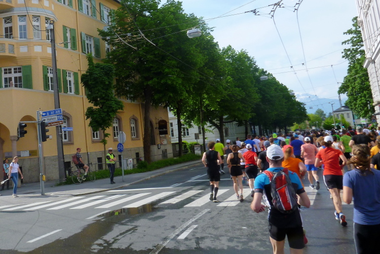 Punkt 09.00 Uhr wird dann der erste Block mit der Elite auf die Reise geschickt. Es dauert einige Minuten, bis das Feld nach vorne aufrückt. Dann ist mein Block um etwa 09.15 Uhr auch an der Reihe. Wir beginnen unser Tagwerk in der Griesgasse, rechterhand der Sternbräu mit dem guten Bier und den feinen Speisen am Vorabend. In wenigen Schritten eilen wir an die Salzach und dem Rudolfskai. Auf dem Mozartsteg sind jetzt nur wenige Fußgänger unterwegs, gestern haben sich dort die Touristen auf den Füßen gestanden. Neben mir läuft der Pacer für die 4.30 Stunden, der vielleicht ein wenig zu weit vorne steht. Aber jetzt noch keine Hektik, wir wollen uns doch im Feld erst ein wenig finden. Die Salzburg Rampant Lion Pipe Band gibt uns mit ihrem schottischen Rhythmus schon ein wenig Drive.