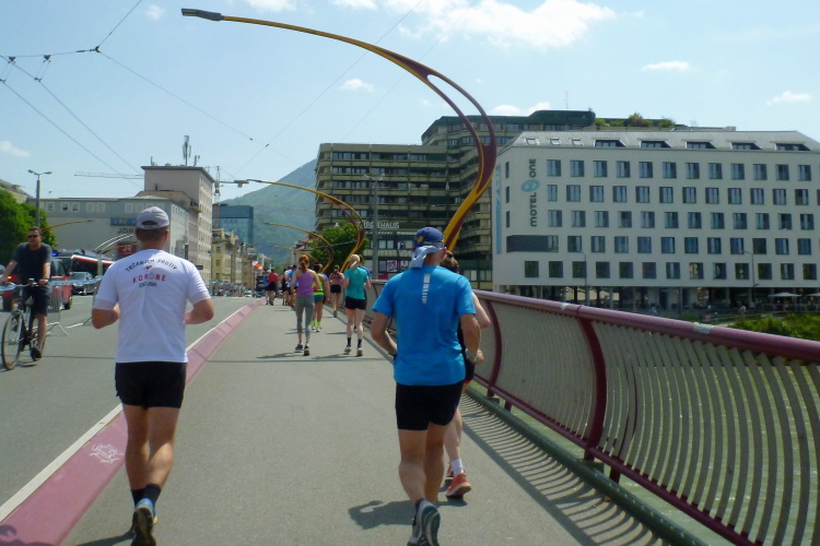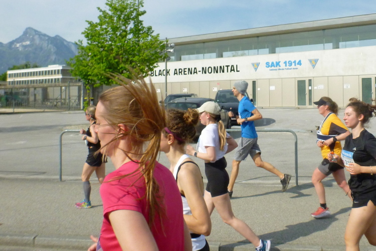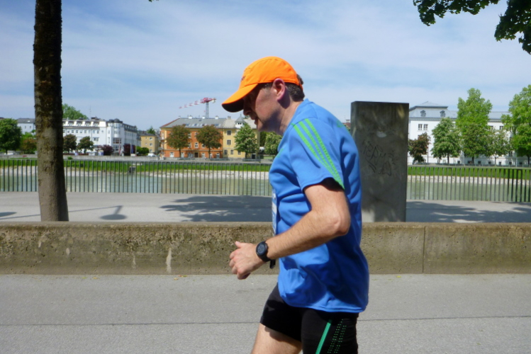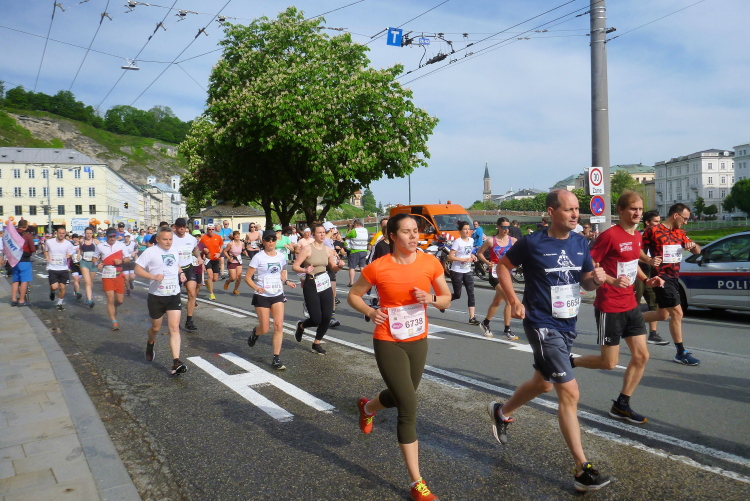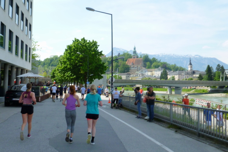 Wir verlassen die Müllner Altstadt und überqueren die Salzach auf der Lehener Brücke und schwenken auf dem Elisabethkai an die Salzach heran. Die Halbmarathonis gehen ihre letzten zwei Kilometer an, einige erhöhen ihr Tempo. Auffallend ist, dass wir, so gut es geht, im Schatten laufen. Vorher zeigte ein Thermometer an einer Apotheke bereits 24 Grad.