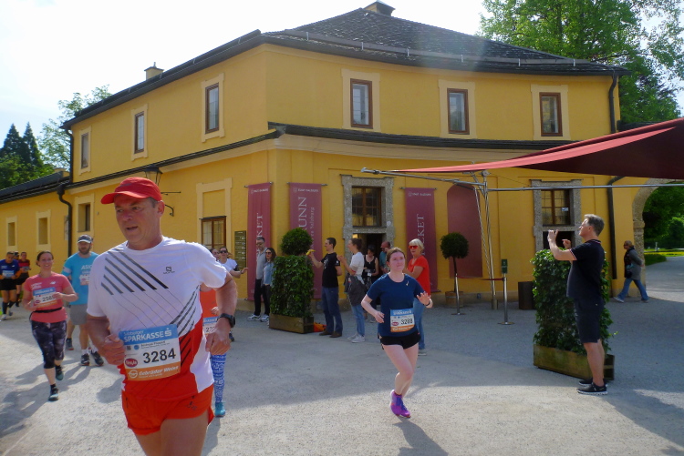 Schloss Hellbrunn wurde im frühen 17. Jahrhundert als Lustschloss mit den bekannten Wasserspielen südlich des heutigen Stadtteils Morzg vom Salzburger Fürsterzbischof Markus Sittikus von Hohenems erbaut. Wir verlassen den Schlosshof nach rechts und können uns bei der anschließenden Trinkstelle erfrischen. Ein Helfer hat schon einen Wasserschlauch in den Händen. Noch werden damit Wasserbecher aufgefüllt. Wer weiß, welchen Zweck der Wasserschlauch bei unserer zweiten Runde spielen wird. Die Läufer greifen eifrig zu, die Helfer rödeln. Ein paar Schluck für den Bauch, das Noagerl gieße ich mir über die Birne.