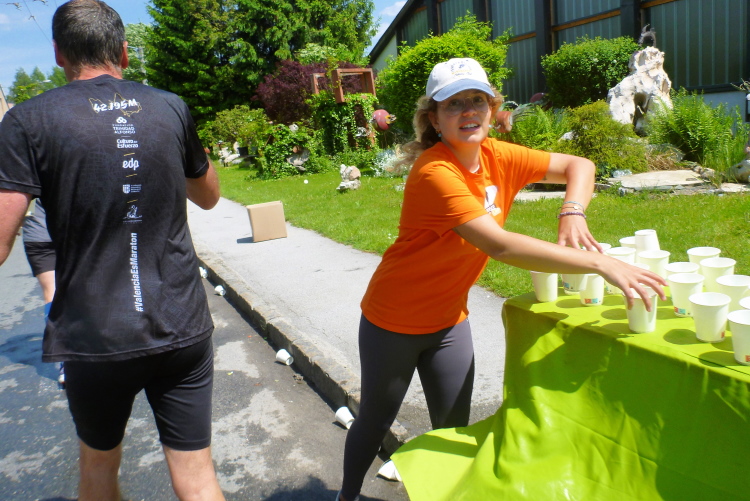 Gerade als ich wieder antraben will, sehe ich Gerhard vor mir, auch ihn hat es zerlegt. Er nimmt die vorübergehende Schwäche locker. Bis zur folgenden Trinkstelle bleiben wir zusammen und schwelgen in Erinnerungen wie Linz, wo er mir deutlich davongelaufen ist, der Hund. Heute könnte ich es ihm heimzahlen, bei dem Gedanken muss ich grinsen. An der Verpflegung schütte ich mir Elektrolyt in die trockene Gurgel, würge ein Stück Banane in den knurrenden Magen und leere einen Wasserbecher auf meine Birne. Dies innerhalb weniger Sekunden. Ich drehe mich um und sehe Gerhard vollbeladen mit Bechern von der Trinkstelle weggehen.