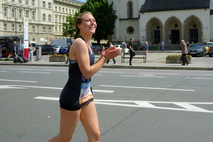 Schnell erreiche ich wieder die Hellbrunner Allee. Ich fühle mich gut, so dass ich beide 4.15er-Pacer hinter mir gelassen habe. Dann lese ich auf einem Shirt „Fit fürs Laufen, fit fürs Saufen“ und staune als ich sehe, wer das Shirt trägt. Kein Bierbauch, es ist eine unbekannte Staffelläuferin.