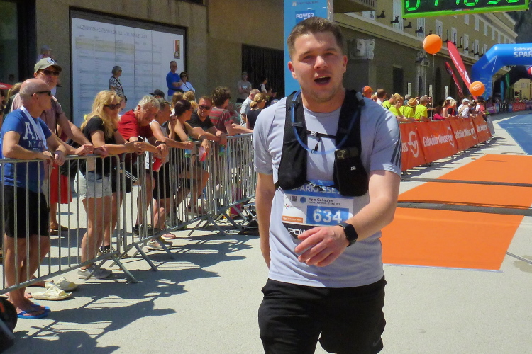 Nach ein paar Metern biegen wir in die Griesgasse ein, die wir vor zwei Stunden in der Gegenrichtung verlassen haben. Die Zuschauer aus den Wirtschaften und Cafes geht es gut, sie klatschen uns weiter. Über die Bürgerspitalgasse erreichen wir den Herbert-von-Karajan-Platz, wo an der Pferdeschwemme die Streckenteilung wartet. Die Halbmarathonis laufen gerade, wir halten uns halblinks. Ein Ordner passt auf, dass jeder sich richtig einordnet.