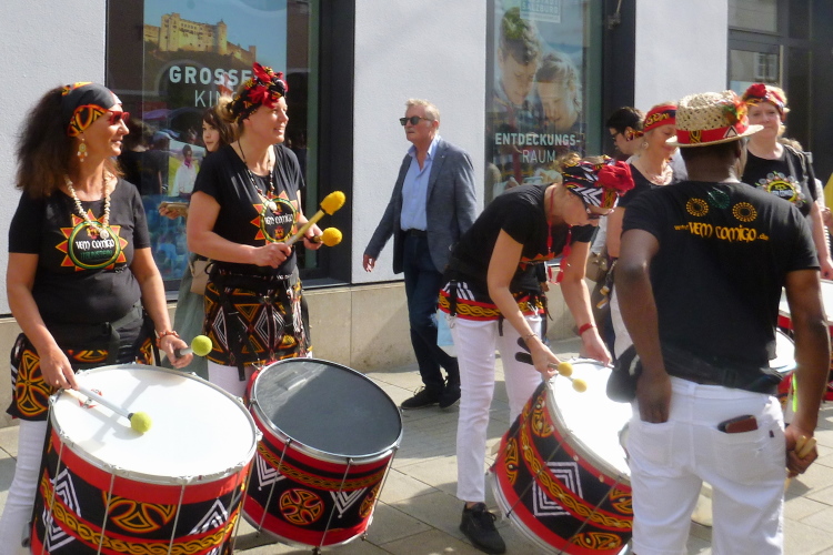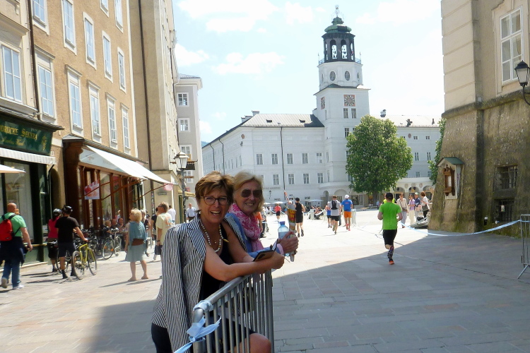 Nur wenig später sehen wir dann auf dem Mirabellplatz das gleichnamige Schloss mit seinen schönen Park. Erbaut wurde es 1606 von Erzbischof Wolf Dietrich von Raitenau außerhalb der damaligen Stadtmauern für seine Geliebte oder heimliche Ehefrau Salome Alt. Der Name kommt aus dem Italienischen „mirabile“ und „bella“ (bewundernswert und schön). Die Frucht der Mirabelle hat ihren Namen wohl auch daher. Über ein paar enge Gassen erreichen wir dann das Platzl, wo uns die Pipeband Salzburg weitertreibt. Mit Schwung geht es über die Staatsbrücke, die mit Fahnen geschmückt wurde. Das können die Österreicher, da krieg nicht nur ich a „Ganslhaut“.