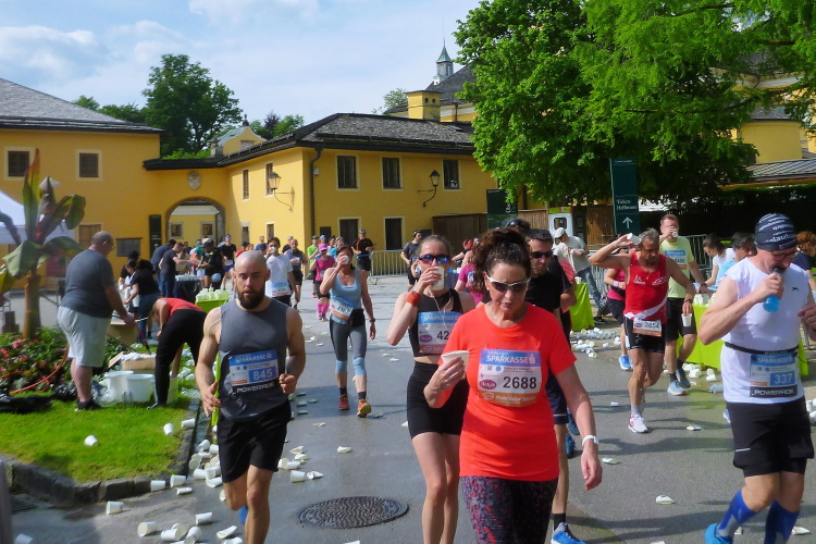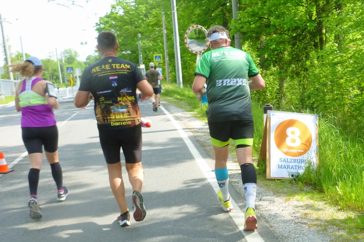Auf der anderen Seite des Weihers haben wir einen schönen Blick auf das Schloss Leopoldskron, das in den Jahren 1736 bis 1740 vom Erzbischof Leopold Anton Eleutherius Freiherr von Firmian errichtet wurde. Bayernkönig Ludwig I bewohnte es zeitweilig nach seiner Abdankung. Heute gehört die Anlage der amerikanischen NGO Salzburg Seminar, wo sich internationale Führungskräfte aus Politik, Wissenschaft und Wirtschaft zu bestimmten Themen treffen. Die Trommlergruppe SoriNaTu trommelt uns kurz nach Kilometer 12 in den Zwieselweg. Mit einem „Gemma“ schicken uns Zuschauer weiter. Mittlerweile hänge ich seit ein paar Kilometern am Pacemaker für die 4.15 Stunden. Das Tempo scheint zu passen, auch wenn ich immer wieder Kilometer von deutlich unter sechs Minuten habe. An den Tankstellen verliere ich Sekunden bei der Aufnahme von Nahrung und Flüssigkeit. Als feste Nahrung sehe ich Orangen und Bananen, Getränke werden als Aqua, Powerade und Cola zugereicht.