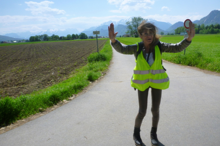 Die Hellbrunner Allee ist die älteste erhaltene Allee Mitteleuropas, die als gerade Verbindung das Wasserschloss Freisaal und das Schloss Hellbrunn verbindet. Rechts ist der Untersberg zu sehen, schneebedeckt. Gleich nach Kilometer fünf sehe ich das Eingangsportal zur Schlossanlage Hellbrunn. Gitarrist Klaus-Jürgen Spannhof werkelt unter einem Sonnenschirm an seinem Musikinstrument herum. Gleich nach dem Tor sehe ich Leon in seinem bajuwarischen Outfit.