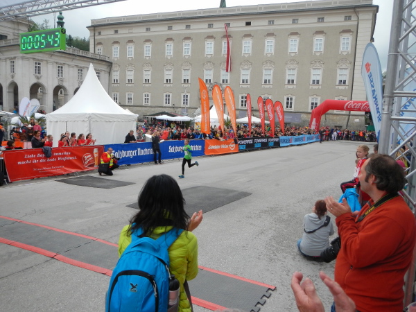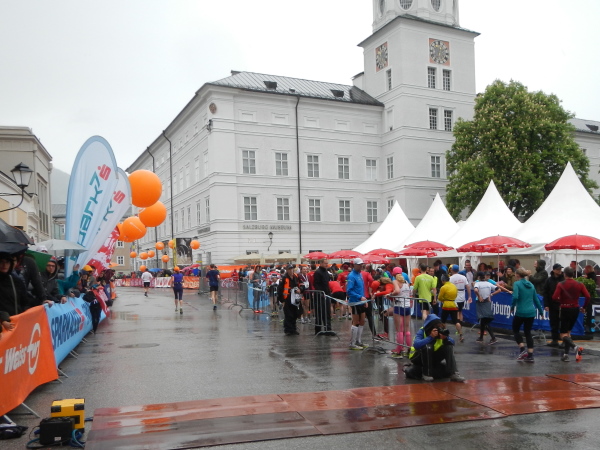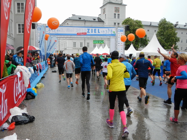 Auf dem letzten halben Kilometer lasse ich historische Kulisse Kulisse sein und werfe alles noch in Rennen, was ich mobilisieren kann. Trotzdem höre ich beim Zieleinlauf, dass ich mit Namen erwähnt und mein Bericht auf marathon4you.de bereits angekündigt wird. Das Ziel mit der 4:10 erreiche ich tatsächlich, schöpfe diese zehnte Minute aber bis auf drei Sekunden voll aus. Na ja, wenn ich so weiterlaufen und mich bei jedem weiteren Marathon um so viele Minuten verbessern kann, dann müssen sich die Kenianer bis in zwei Jahren aber warm anziehen. Trotz PB auf der Waage habe ich eine Jahres-PB im Marathon aufgestellt, was ich selbst für ganz beachtlich betrachte. Man könnte also sagen: „Die Kugel rollt“ – oder in diesem Fall „Die Mozartkugel rollt“.