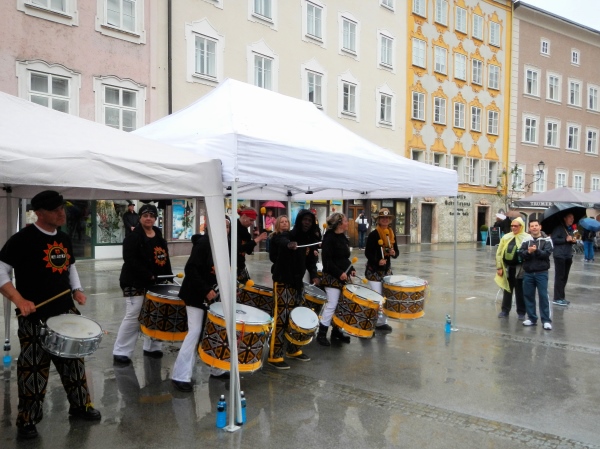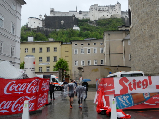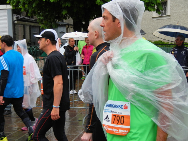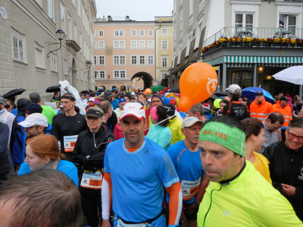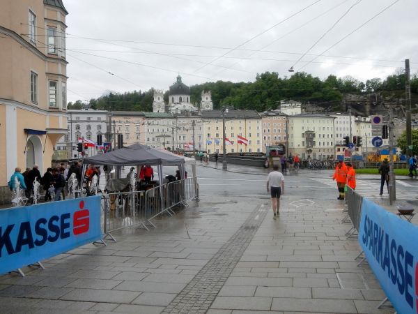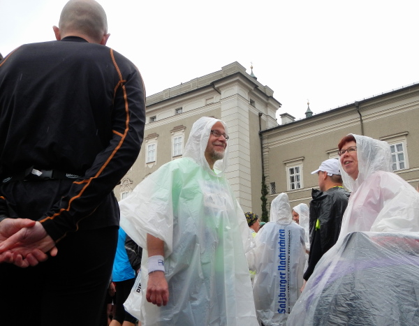 Überall, wo man sich unterstellen kann, stehen Läufer und warten darauf, sich in einen der Startblöcke einreihen zu können. Verhüllt von einem von den Salzburger Nachrichten angebotenen Regenschutz bewege ich mich schon eine halbe Stunde vor dem Start im Dauerregen in diesem Bereich auf und ab. Fotografieren wird heute nicht einfach. Im strömenden Regen laufen und dabei weder von oben, noch von vorne oder gar vom Spritzwasser von unten Wasser auf das Objektiv zu bekommen, ist die große Herausforderung.