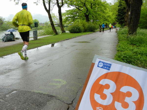 Die zahlreichen Halbmarathonis halten sich rechts und laufen vor dem Überqueren der Ziellinie über den blauen Teppich, ich widerstehe der Versuchung und mache mich auf die zweite Runde. Diese wird zweifellos härter werden, denn ich habe für die erste nur knapp zwei Stunden investiert. Dafür werde ich büßen müssen. In einer Hinsicht gibt es hingegen eine Verbesserung: der Regen lässt nach.