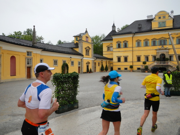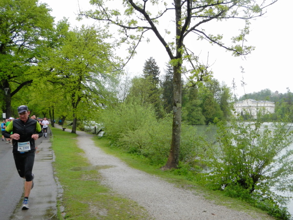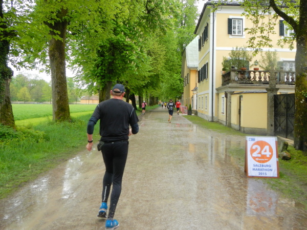 Um den Leopoldskroner Weiher herum ist der Salzburg Marathon wieder ganz Landschaftslauf. An der nördlichen Spitze liegt das Schloss Leopoldskron. Von der Straße her wirkt das als Seminarhotel genutzte Haus nicht überaus auffällig. Dass dieses als Sommerresidenz – nein, nicht als Lustschloss – gebaute Schloss einer der Hauptdrehorte von „The Sound of Music“ war, ist leicht verständlich wenn man es von der Westseite des Weihers betrachtet. Als Läufer muss man dazu schon ordentlich den Kopf drehen, doch es lohnt sich. Zeit dazu habe ich sowieso, denn von der Gruppe um den Zugläufer für 4:15 sehe ich nichts und niemanden. Ich bin ihnen enteilt und damit für meine konditionellen Verhältnisse viel zu schnell unterwegs. Was soll’s? Eine schnelle Runde als Training und Aufsteller, dass es langsam wieder besser rollt, und eine zweite Runde für den Aufbau der Ausdauer, für welche ich nicht alle Zeit der Welt aber viel Reserve habe, so soll es recht sein.