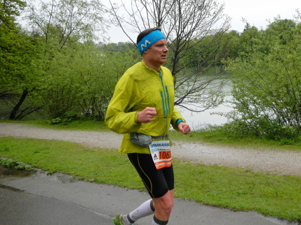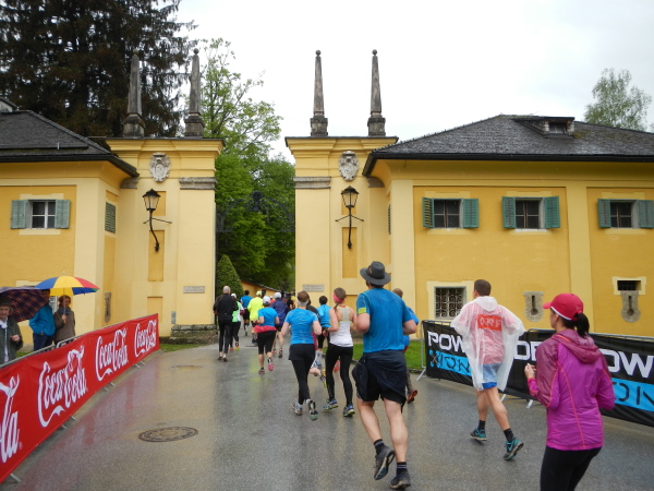 Besonders nach dem Versorgungspunkt am Leopoldskroner Weiher, wo ich endlich Bananen bunkern kann, geht es wieder verhältnismäßig beschwingt. Beim Schloss steht noch der Startbogen des City Runs, dem 10km-Lauf, und auch der Moderator ist noch im Einsatz. Er schmeichelt mir, indem er einen Läufer als „jungen Herrn mit orangen Socken bezeichnet“. Im ausgedünnten Feld der zweiten Runde ist außer mir aber kein Läufer mit orangen Socken zu sehen.