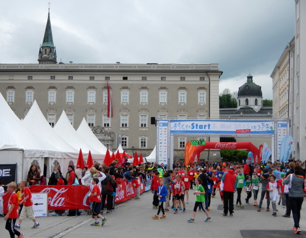 Die etwas mehr als zwei Kilometer vom Hotel zum Start am Residenzplatz sind mein Aufwärm- und minimale Streckenbesichtigungsprogramm, das mich am Schloss Mirabell vorbei und über die Salzach führt. Wenn ich zum dritten Mal da bin, habe ich das Ziel fast vor Augen. Aber, wer redet da schon vom Aufhören. Jetzt wird erstmal klar zum Start gemacht.