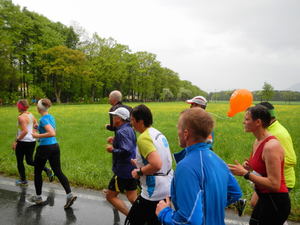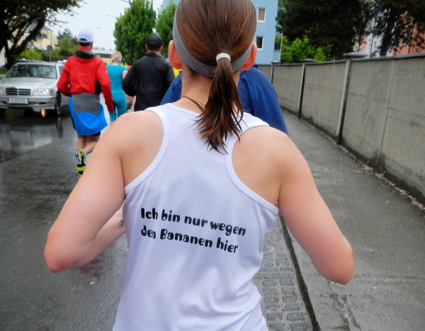 In der Hellbrunner Allee sehe ich – der Geraden sei Dank – weiter vorne die Gruppe um den Zugläufer für 4:00. Ich weiß, ich bin zu schnell unterwegs, hoffe nun aber, dass ich nicht vom nächsten Ballonträger versägt werde. Eine weitere Verbesserung meiner diesjährigen Marathonzeit wäre motivierend. Im Moment verspüre ich allerdings ein sattes Hungergefühl. Mir ist es ein Rätsel, warum der Körper nicht so leicht umschalten und auf die reichlich vorhandenen Reserven zurückgreifen kann. Ich freue mich auf den Versorgungspunkt beim Schloss Hellbrunn. In Sachen Bananen allerdings vergeblich, die sind schon alle vergeben. Ich versuche das Loch im Magen mit Orangenschnitzen notdürftig zu stopfen und hoffe auf den nächsten VP beim Landskroner Weiher. Dabei muss ich aber an Daniela denken, auf deren Shirt ich gelesen habe „Ich bin nur wegen den Bananen hier“. Da passt es doch wunderbar, dass der Pianist gerade „Always Look on the Bright Side of Life“ spielt.
